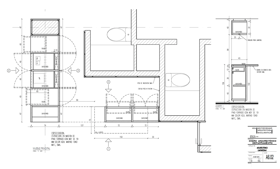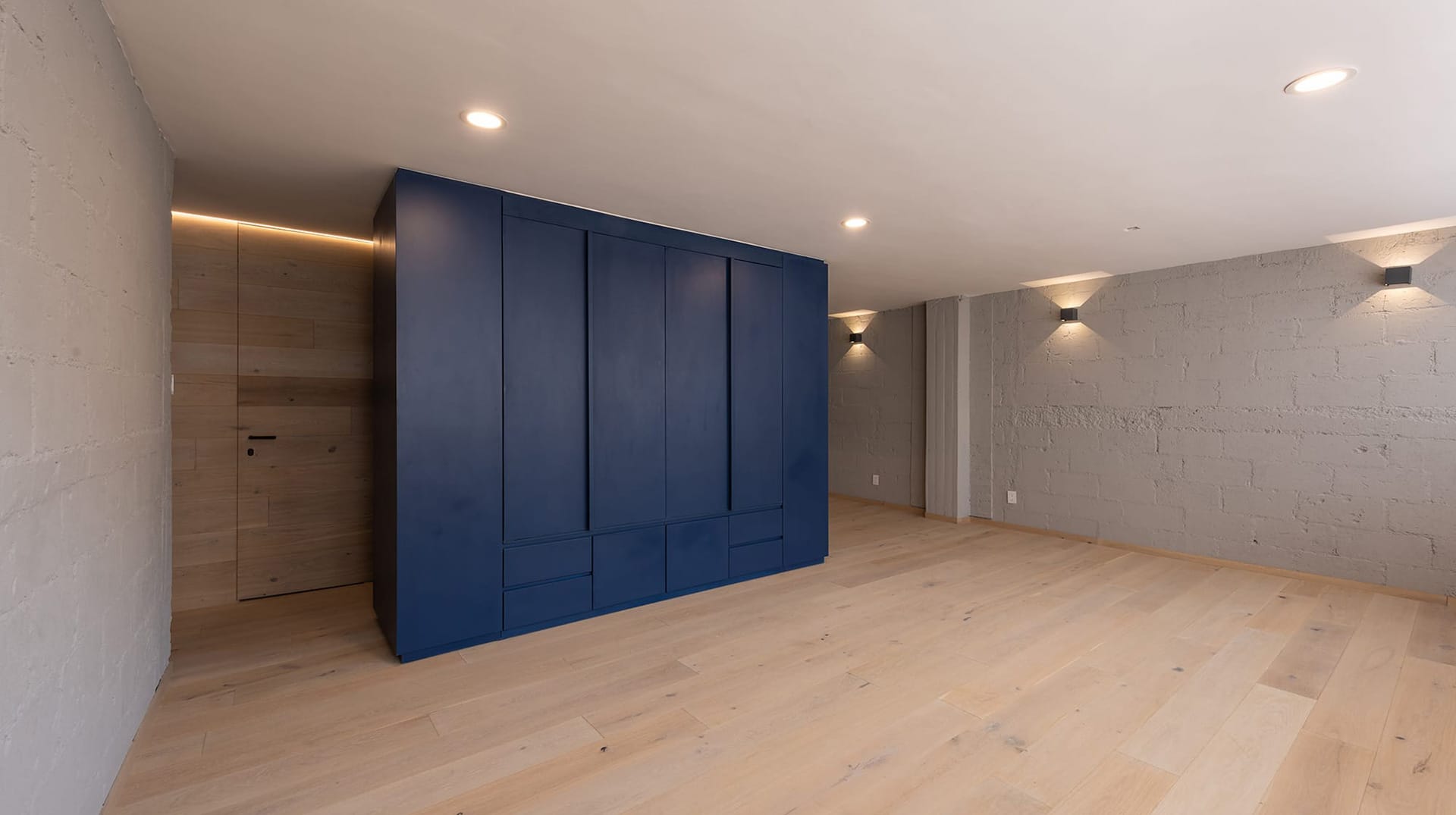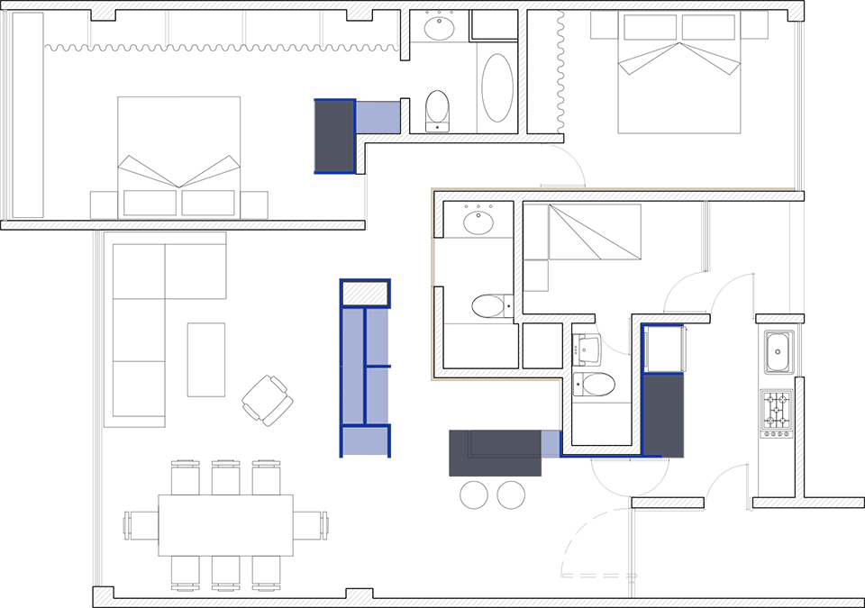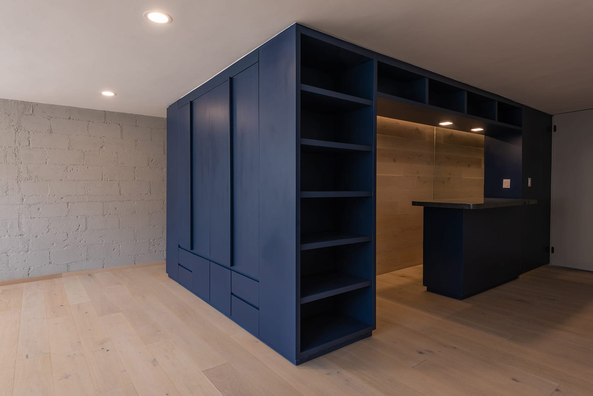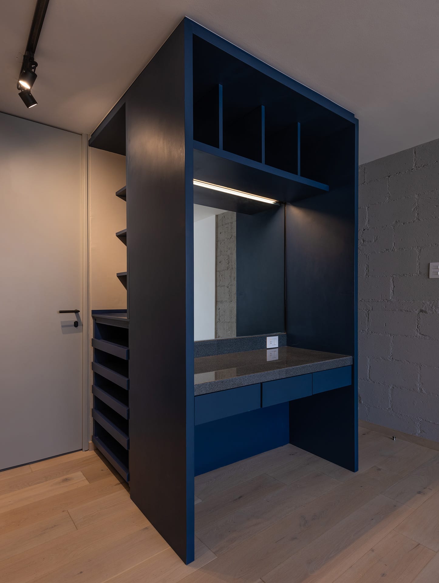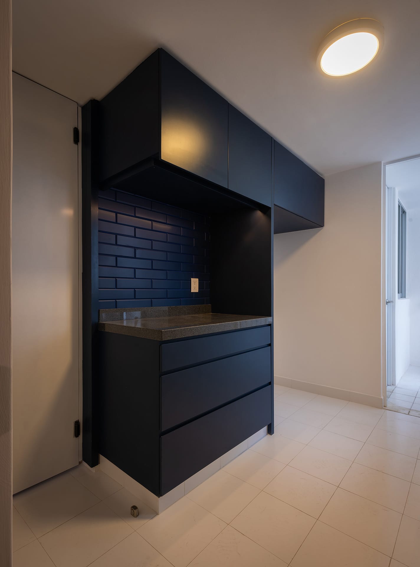 Un mueble azul, presente en todos los espacios del departamento, ubica las áreas de guardado en la cocina, el mueble de TV en la sala, un pantry/bar/desayunador en el acceso y el tocador en la recámara principal. El uso de cortinas para los closets le dá calidez a las recámaras, permitiendo maximizar el área de guardado.
