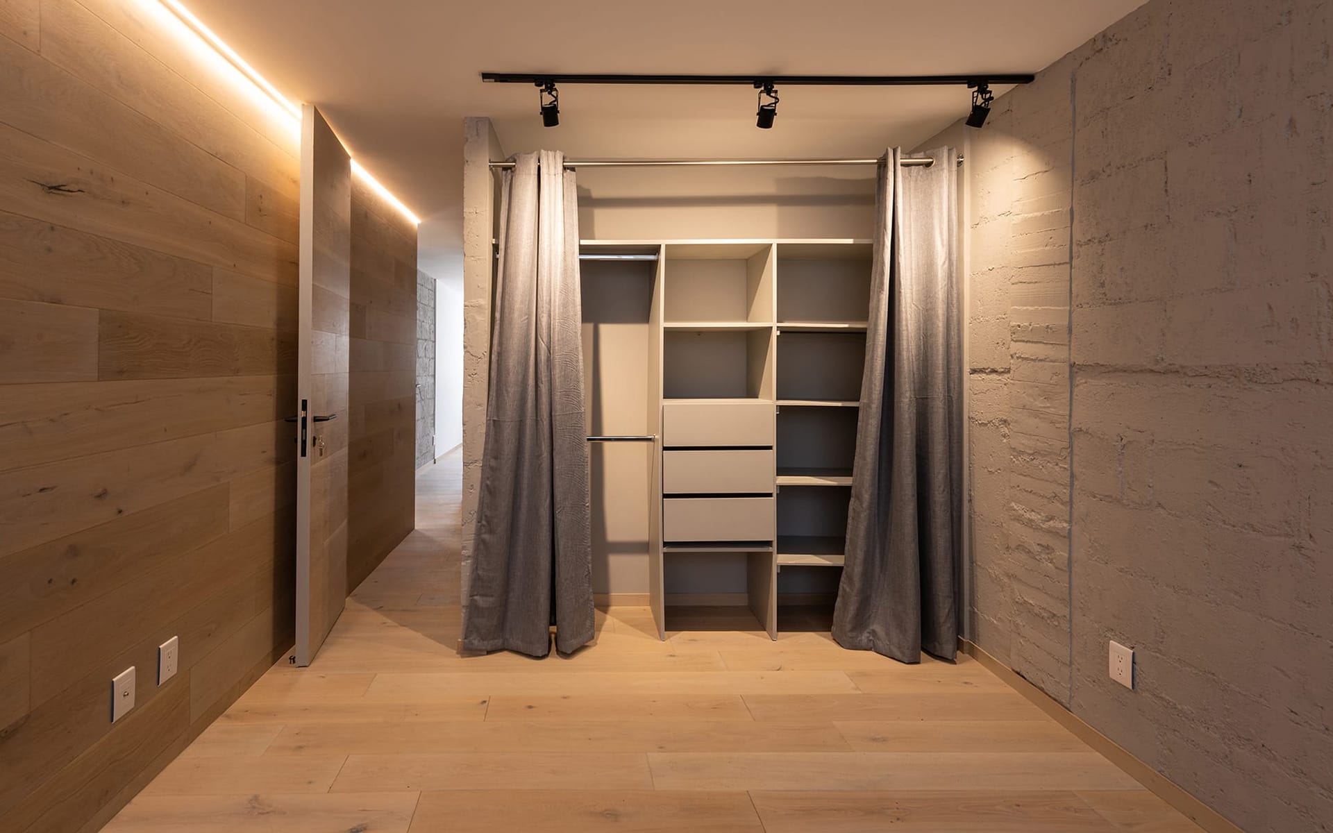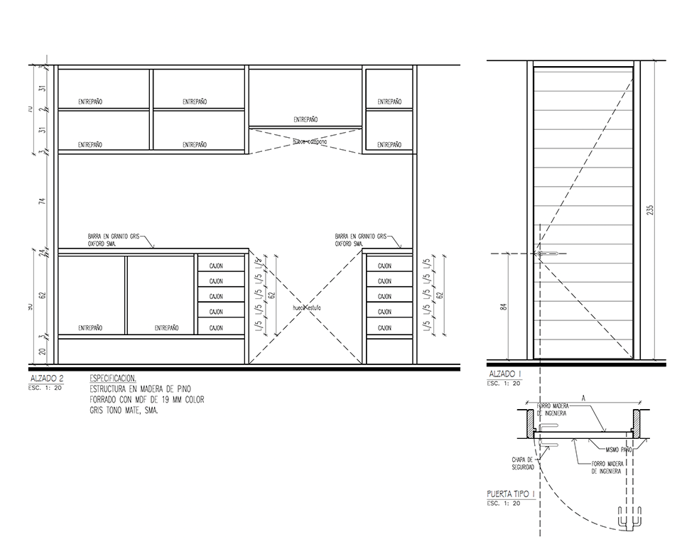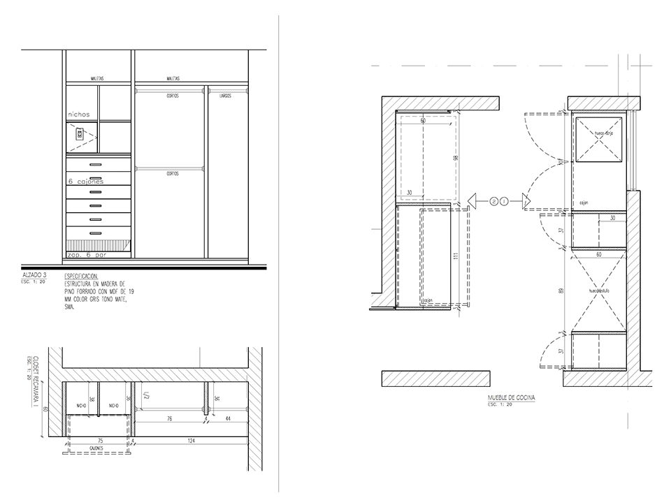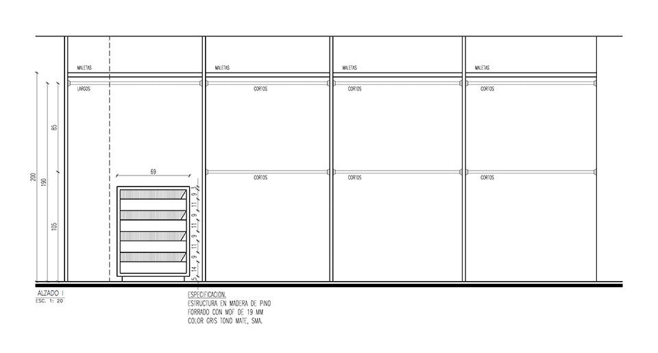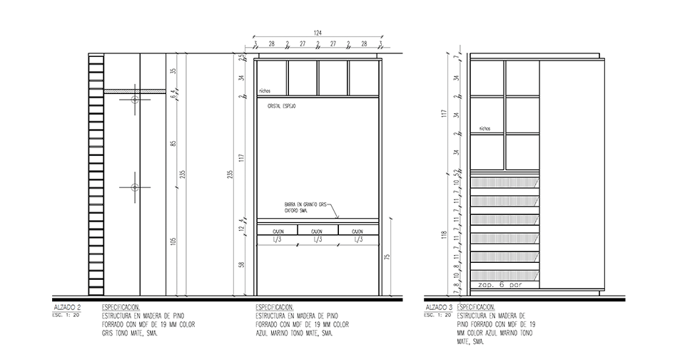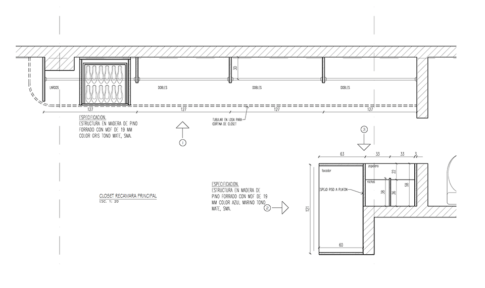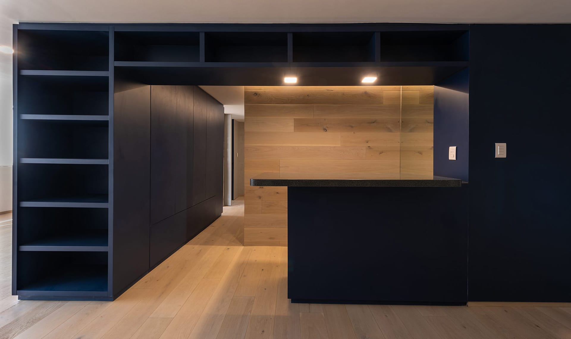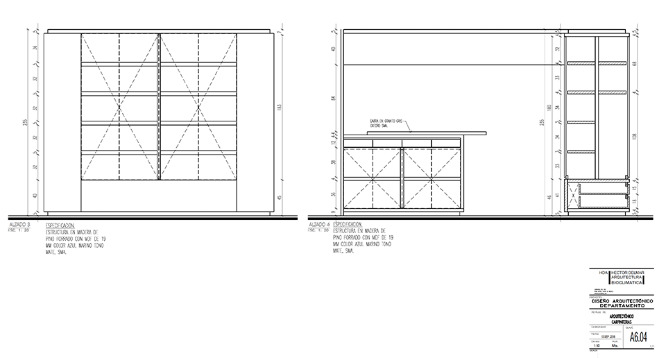 Un mueble azul, presente en todos los espacios del departamento, ubica las áreas de guardado en la cocina, el mueble de TV en la sala, un pantry/bar/desayunador en el acceso y el tocador en la recámara principal. El uso de cortinas para los closets le dá calidez a las recámaras, permitiendo maximizar el área de guardado.