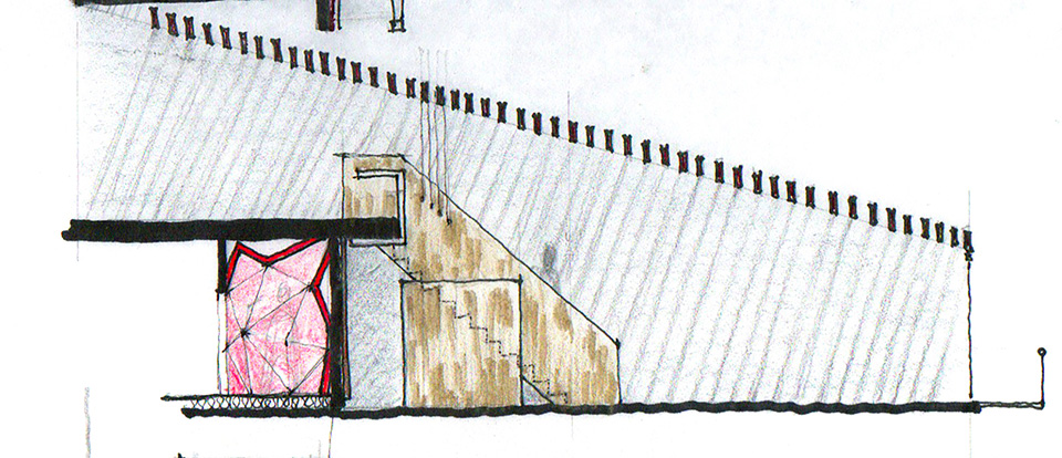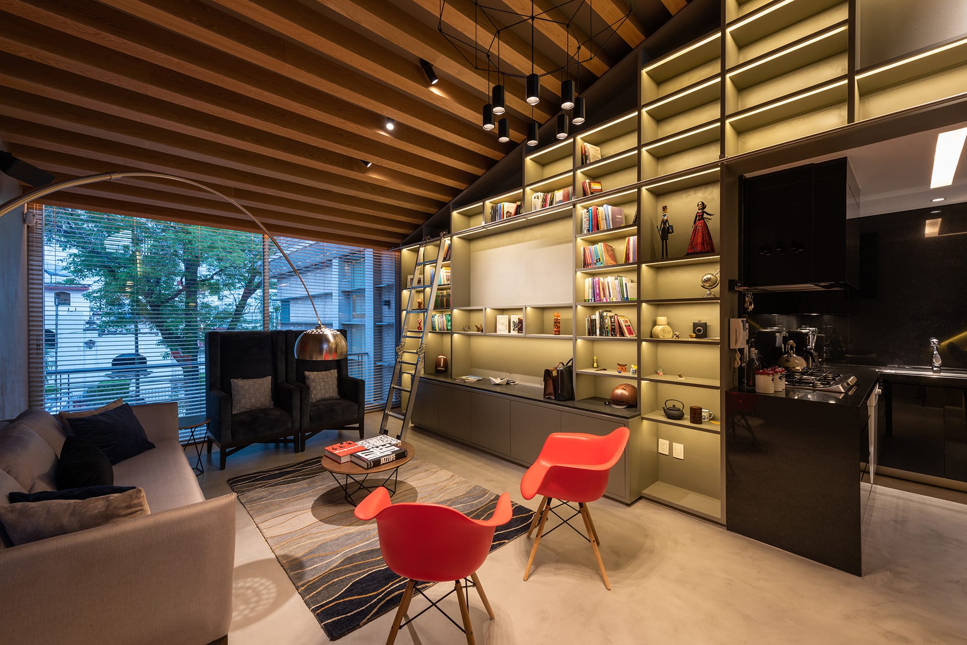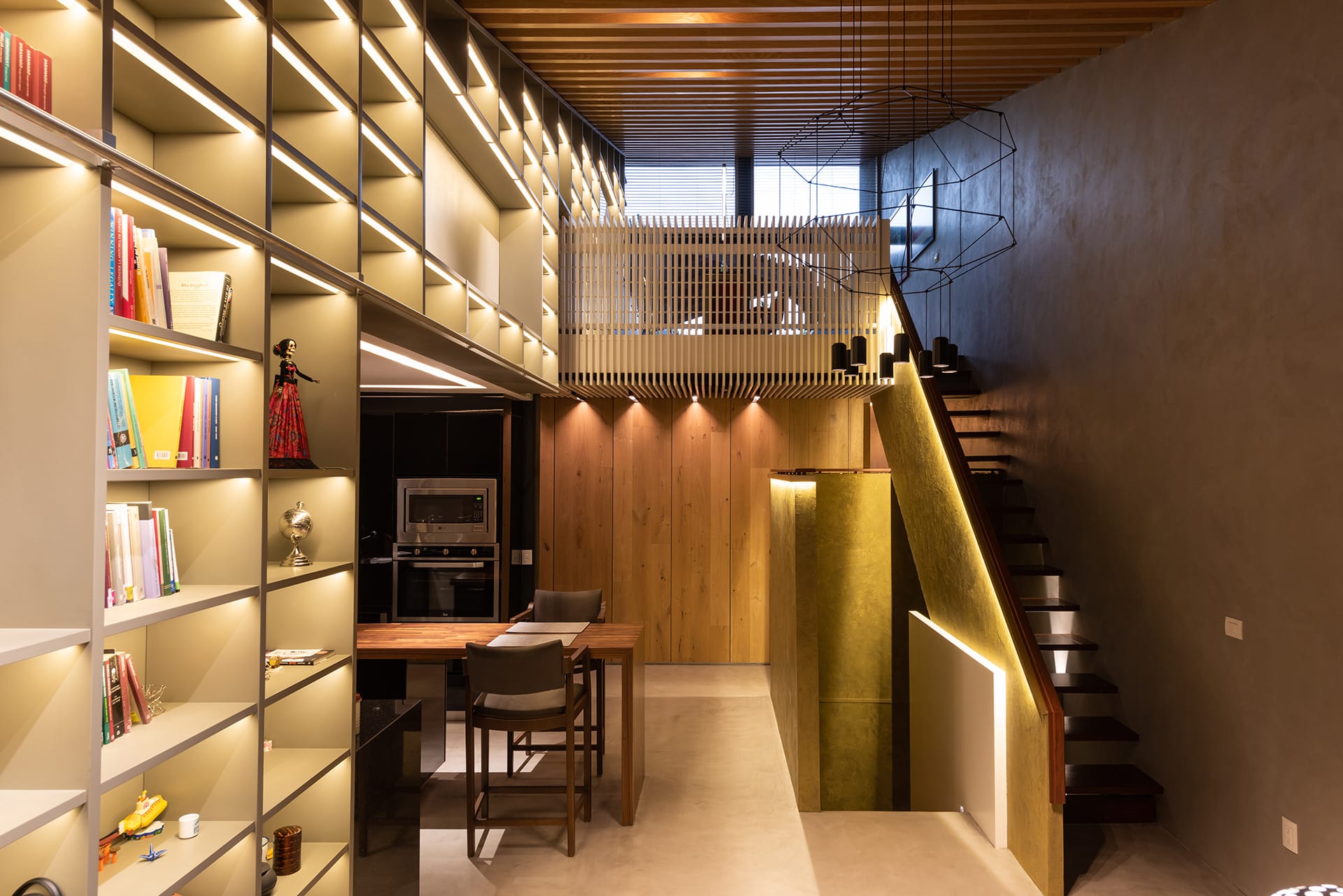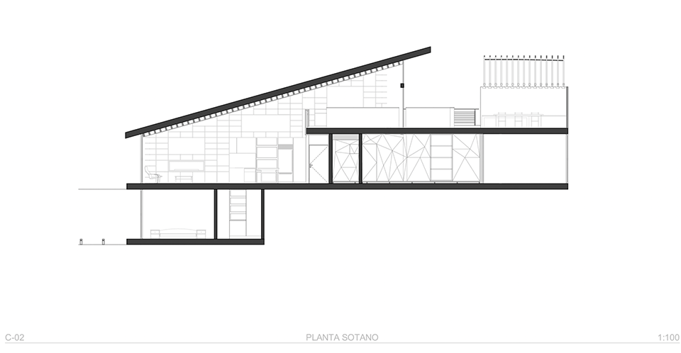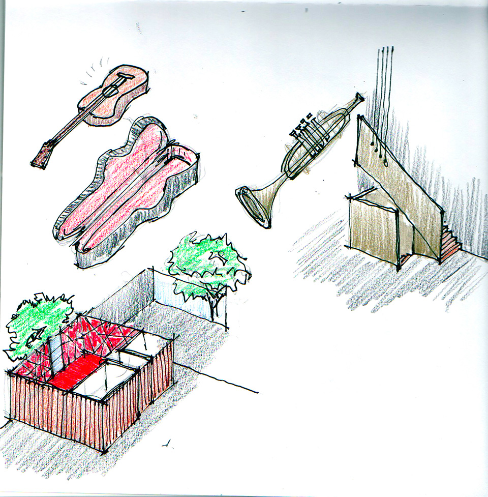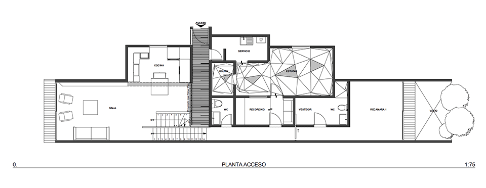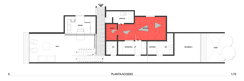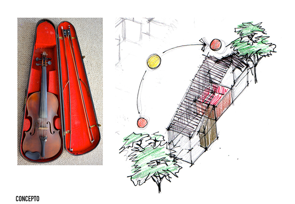 El departamento se concibe como un estuche con instrumentos musicales dentro. Los colores, las formas y las texturas evocan constantemente a instrumentos musicales haciendo sentir al usuario como si pudiera hacer música con el espacio. Una caja de madera alusiva a un instrumento de cuerdas (guitarra, violín, celo, etc.) organiza el acceso escondiendo las puertas de la lavandería, el estudio de grabación y el baño de visitas. La recámara de visitas también funciona como salón audiovisual para ver conciertos y películas, el cuarto de música se diseñó como un cuarto dentro de otro cuarto utilizando pirámides irregulares para generar las condiciones acústicas que permitan grabar y tocar sin molestar a los vecinos. Los muros de este espacio se forraron en un textil color rojo que recuerda el forro interior del estuche de un instrumento musical, convirtiendo al habitante en el instrumento en si. El material de la cocina y del plafón del vestíbulo tienen la materialidad de un piano de concierto. La escultórica escalera de latón da la sensación de un instrumento de viento. Vigas de madera se añadieron al techo inclinado interior y a la terraza con un ritmo que recuerda las cuerdas de una guitarra, un bajo o el interior de un piano, unificando las áreas sociales internas con la terraza ajardinada al exterior.
