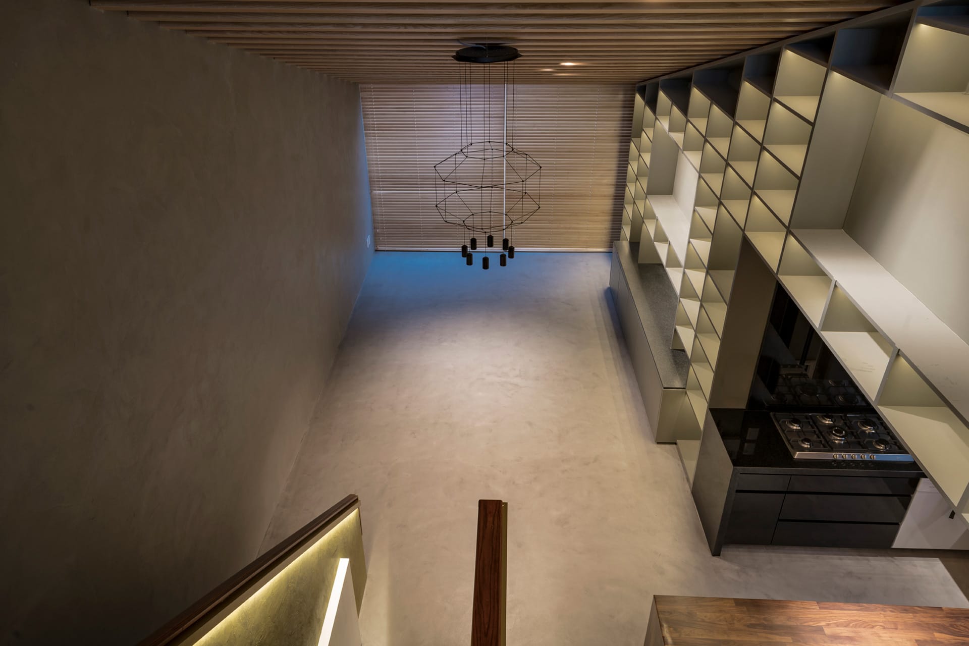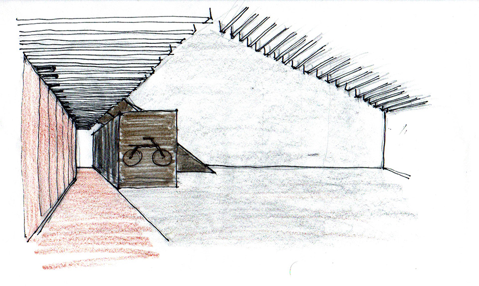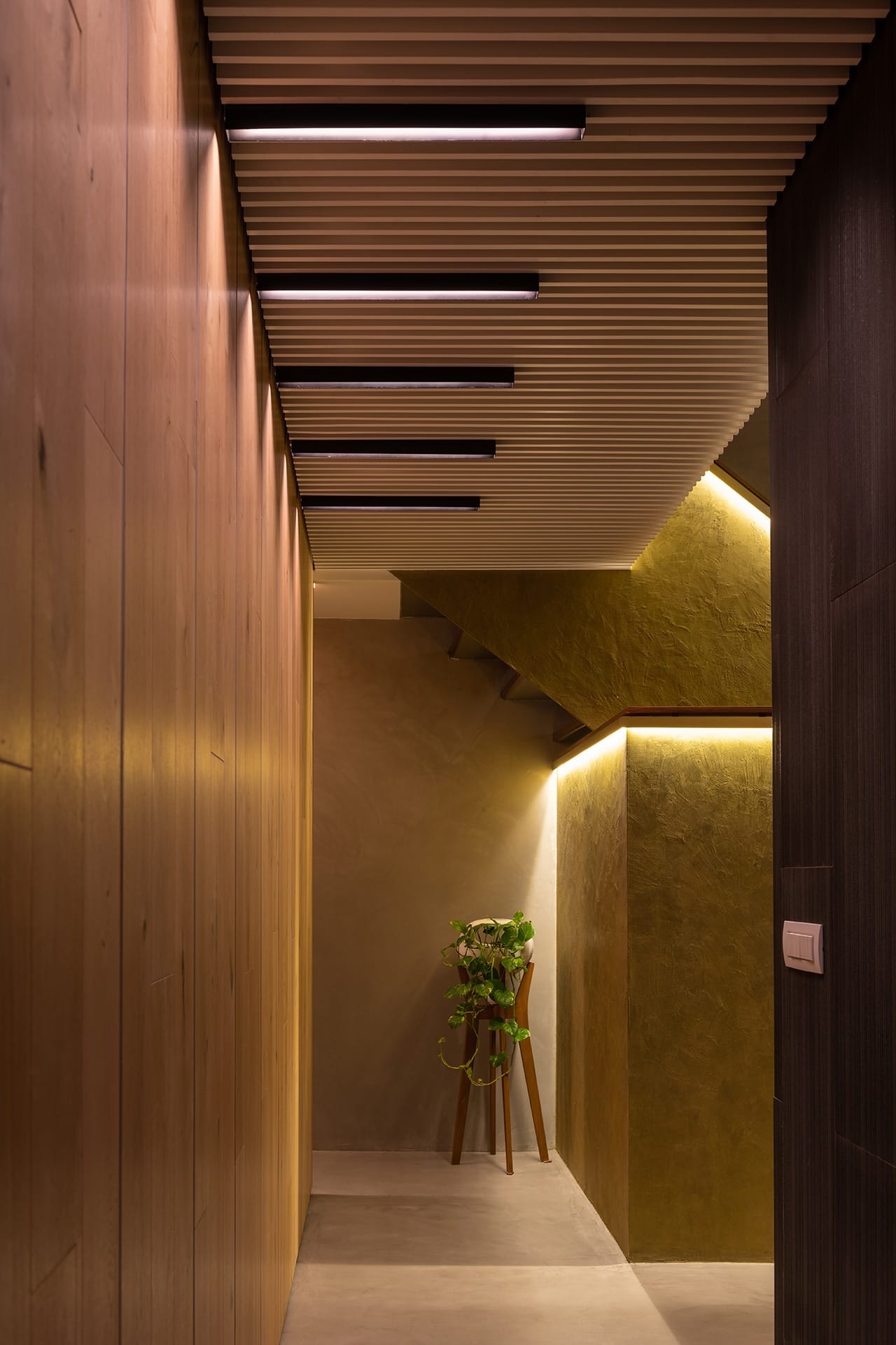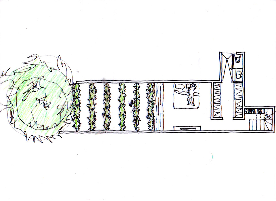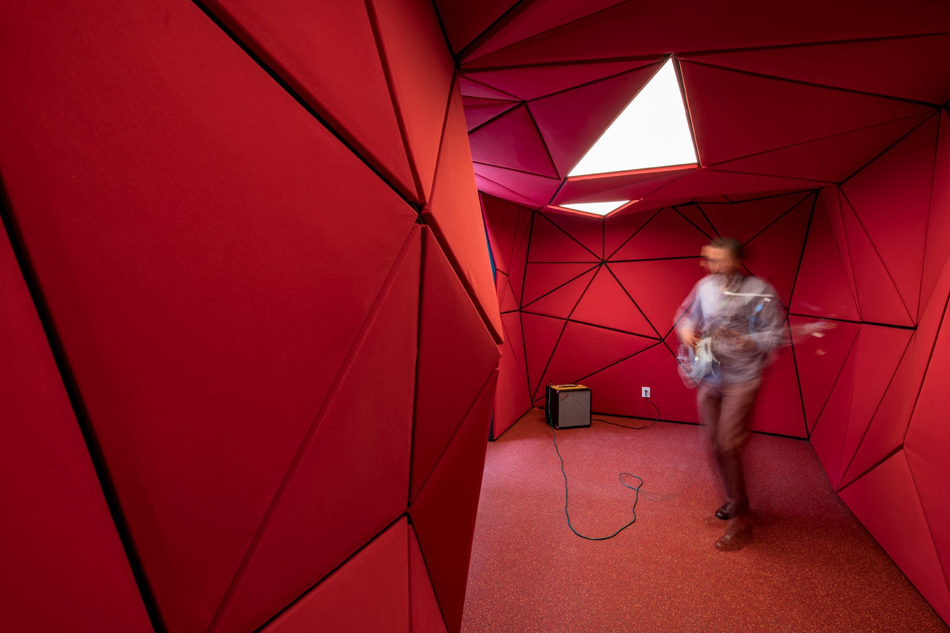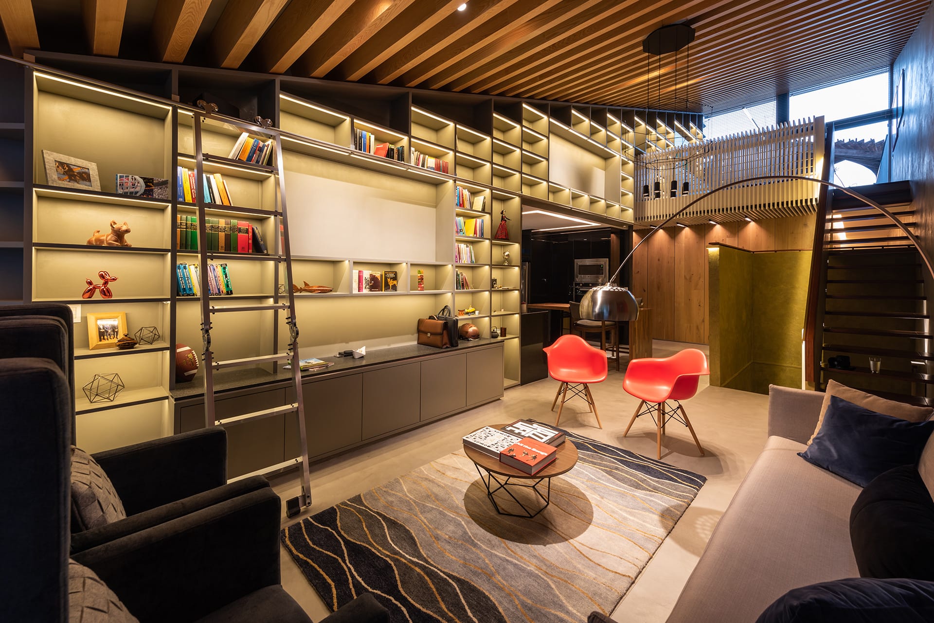 El departamento se concibe como un estuche con instrumentos musicales dentro. Los colores, las formas y las texturas evocan constantemente a instrumentos musicales haciendo sentir al usuario como si pudiera hacer música con el espacio. Una caja de madera alusiva a un instrumento de cuerdas (guitarra, violín, celo, etc.) organiza el acceso escondiendo las puertas de la lavandería, el estudio de grabación y el baño de visitas. La recámara de visitas también funciona como salón audiovisual para ver conciertos y películas, el cuarto de música se diseñó como un cuarto dentro de otro cuarto utilizando pirámides irregulares para generar las condiciones acústicas que permitan grabar y tocar sin molestar a los vecinos. Los muros de este espacio se forraron en un textil color rojo que recuerda el forro interior del estuche de un instrumento musical, convirtiendo al habitante en el instrumento en si. El material de la cocina y del plafón del vestíbulo tienen la materialidad de un piano de concierto. La escultórica escalera de latón da la sensación de un instrumento de viento. Vigas de madera se añadieron al techo inclinado interior y a la terraza con un ritmo que recuerda las cuerdas de una guitarra, un bajo o el interior de un piano, unificando las áreas sociales internas con la terraza ajardinada al exterior.