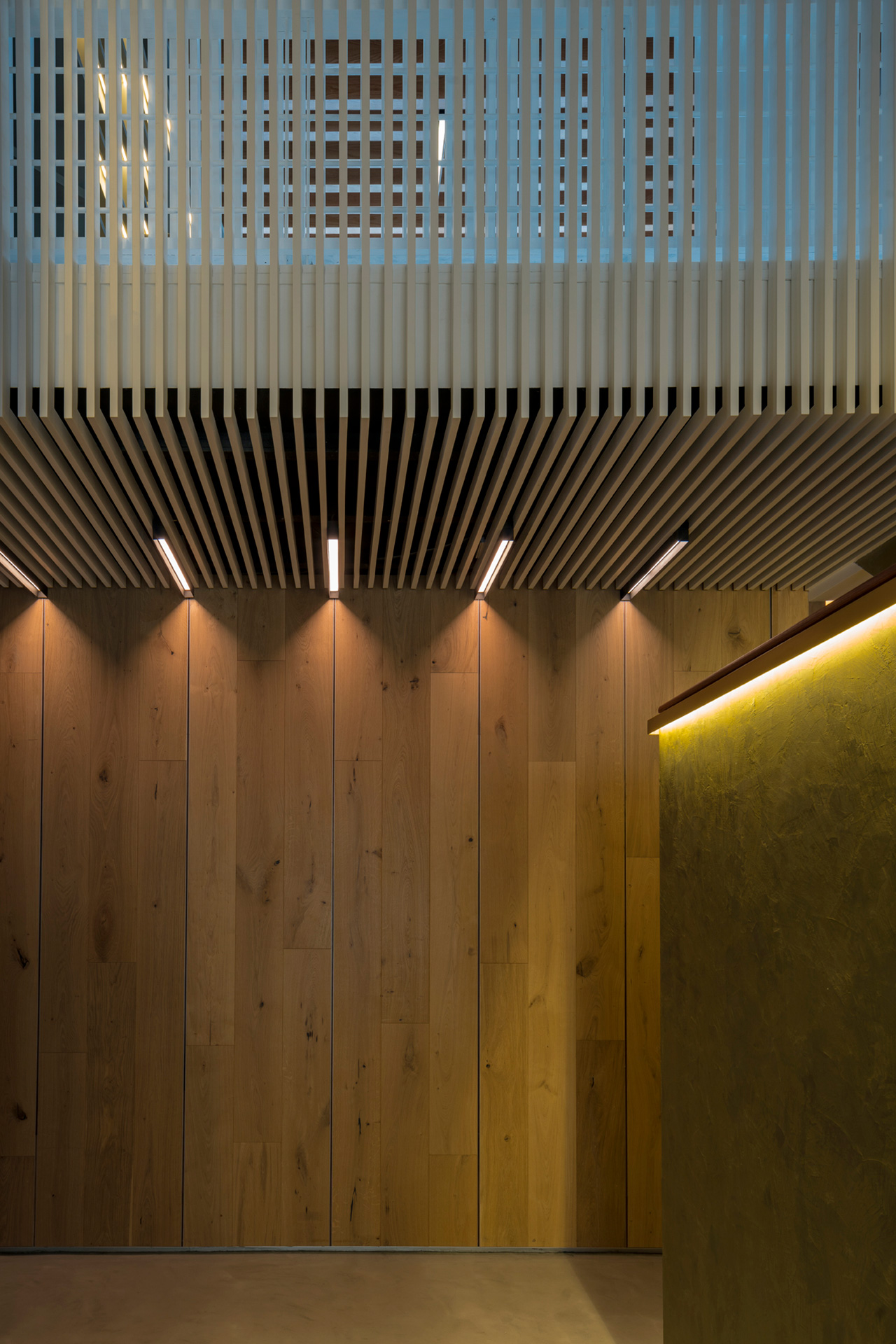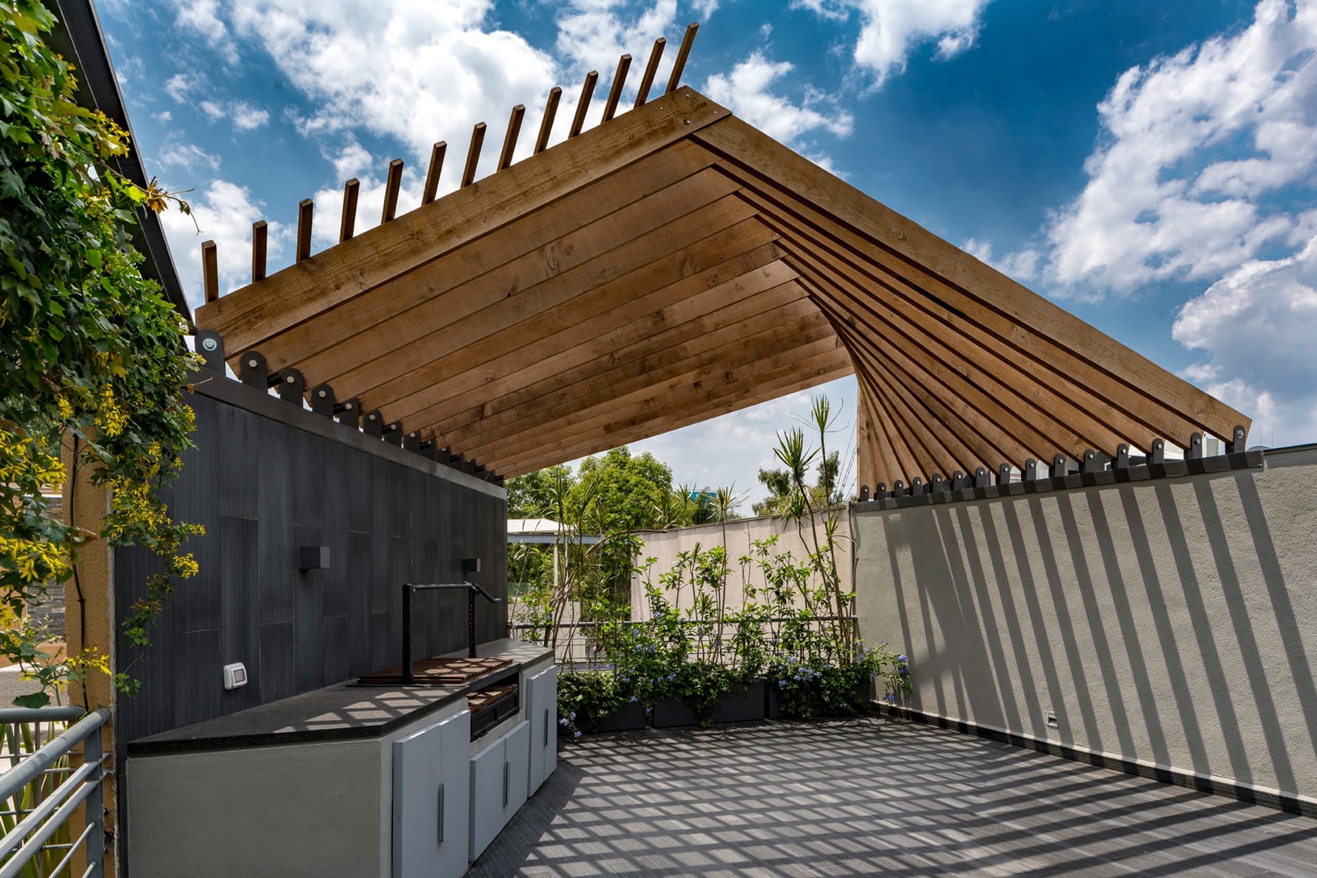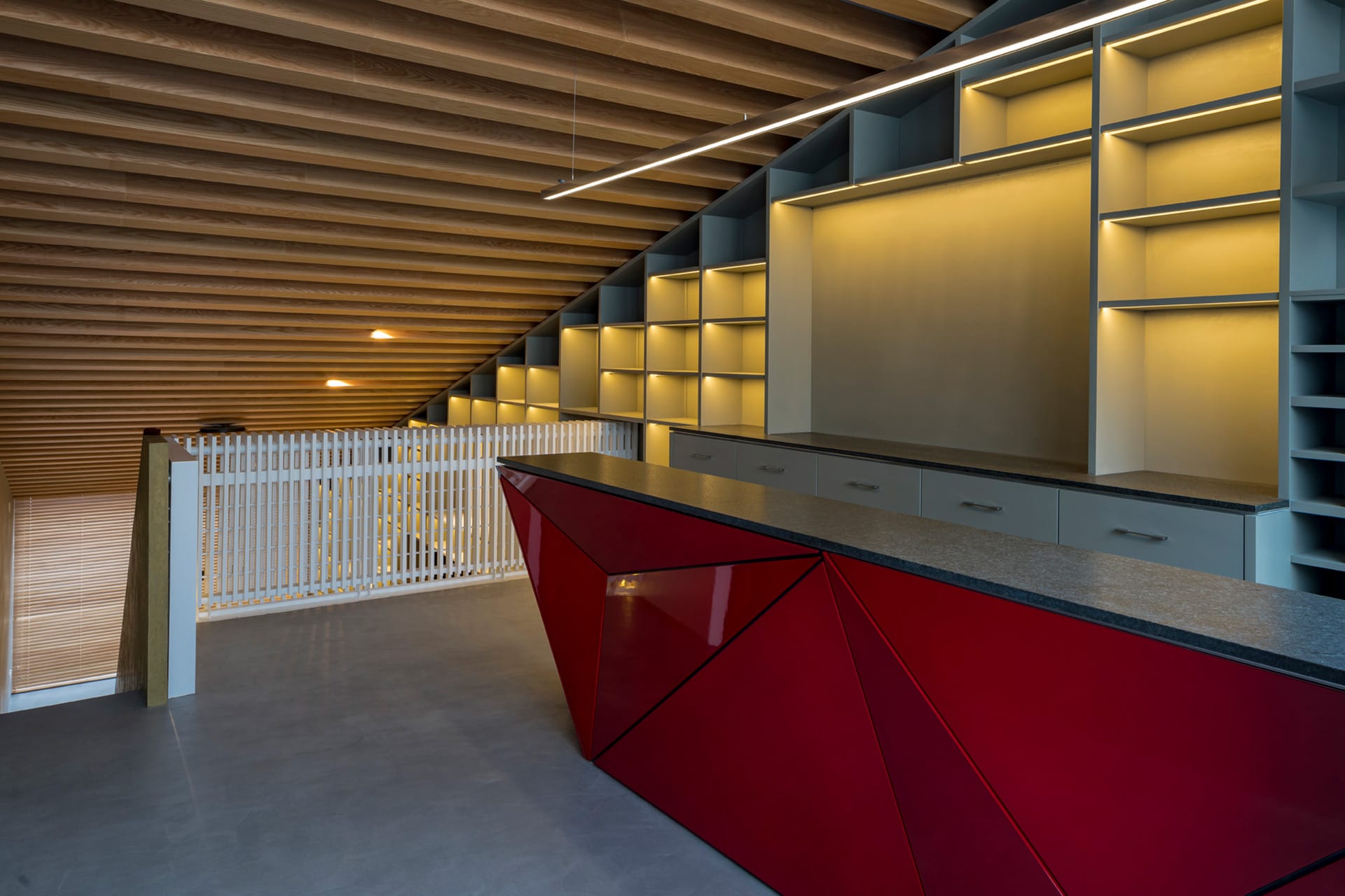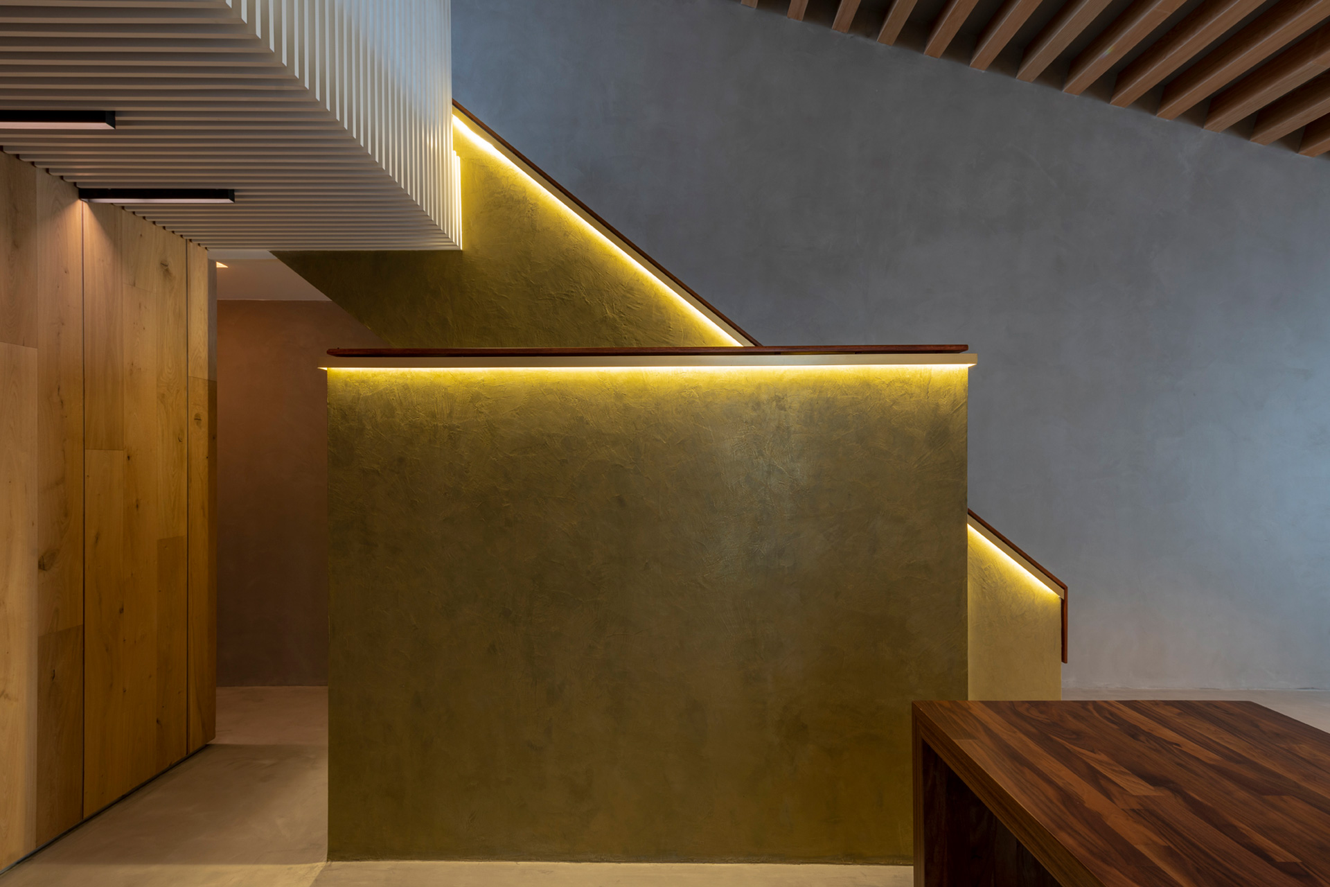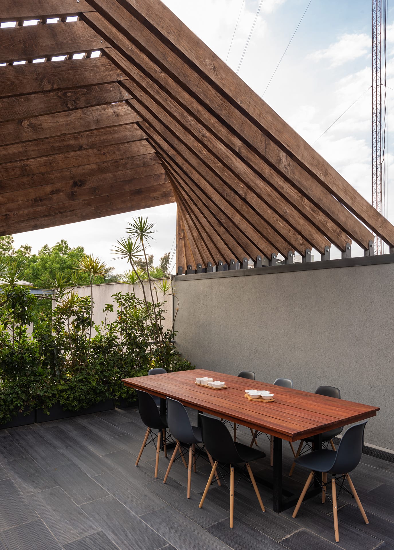 El departamento se concibe como un estuche con instrumentos musicales dentro. Los colores, las formas y las texturas evocan constantemente a instrumentos musicales haciendo sentir al usuario como si pudiera hacer música con el espacio. Una caja de madera alusiva a un instrumento de cuerdas (guitarra, violín, celo, etc.) organiza el acceso escondiendo las puertas de la lavandería, el estudio de grabación y el baño de visitas. La recámara de visitas también funciona como salón audiovisual para ver conciertos y películas, el cuarto de música se diseñó como un cuarto dentro de otro cuarto utilizando pirámides irregulares para generar las condiciones acústicas que permitan grabar y tocar sin molestar a los vecinos. Los muros de este espacio se forraron en un textil color rojo que recuerda el forro interior del estuche de un instrumento musical, convirtiendo al habitante en el instrumento en si. El material de la cocina y del plafón del vestíbulo tienen la materialidad de un piano de concierto. La escultórica escalera de latón da la sensación de un instrumento de viento. Vigas de madera se añadieron al techo inclinado interior y a la terraza con un ritmo que recuerda las cuerdas de una guitarra, un bajo o el interior de un piano, unificando las áreas sociales internas con la terraza ajardinada al exterior.