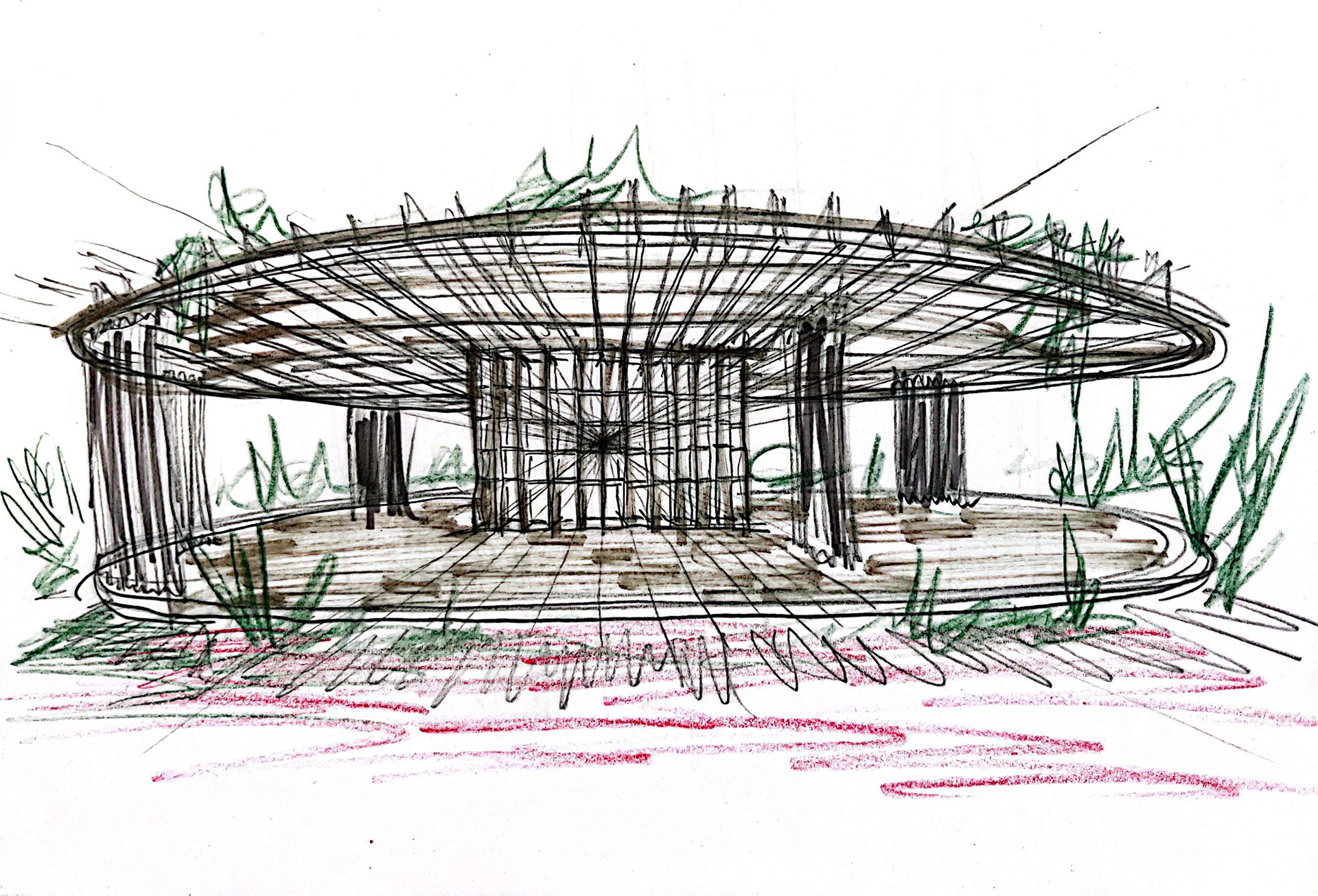 Este espacio exterior refleja la intención y filosofía de los autores, respetando las existencias e integrando nuevos elementos. La fuente se diseñó interactiva, creada a partir de los lavaderos originales con tuberías de cobre que se accionan mediante un sistema de compuertas y manerales desviando el paso del agua. En el centro de este jardín se levantó una estructura reticulada de madera que recuerda el sistema constructivo del edificio techando parte del diverso programa que ofrece el jardín comunitario.
