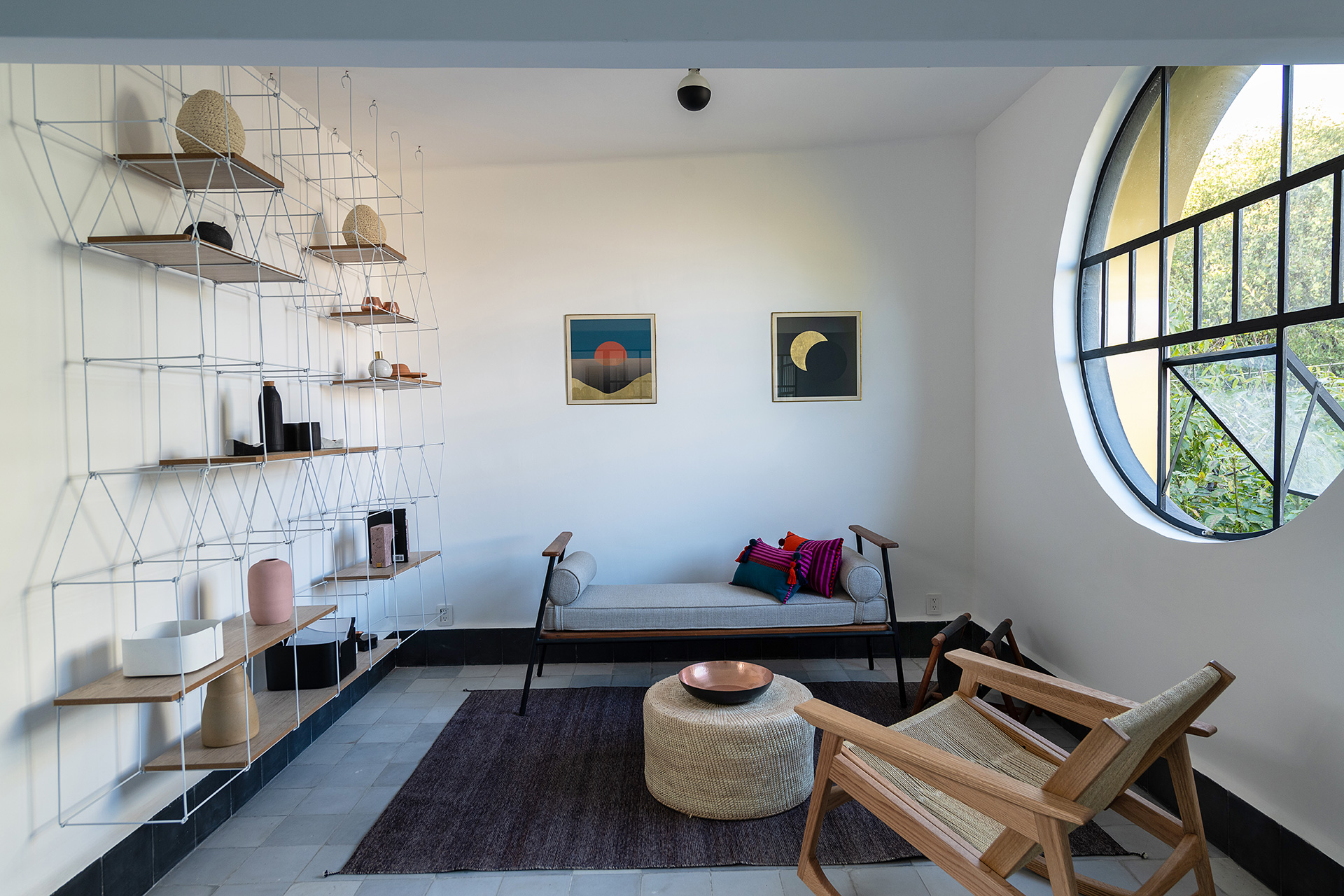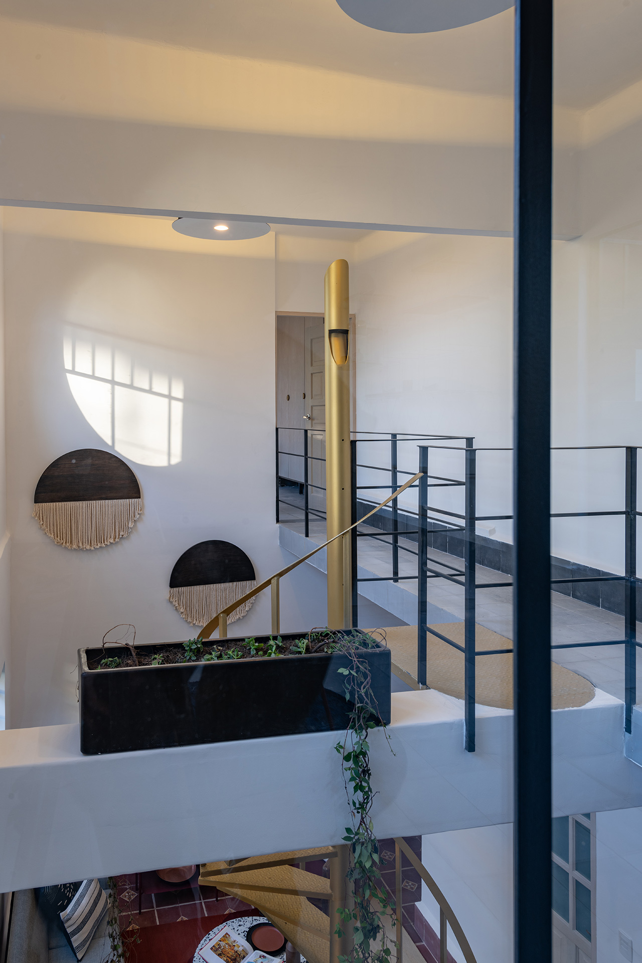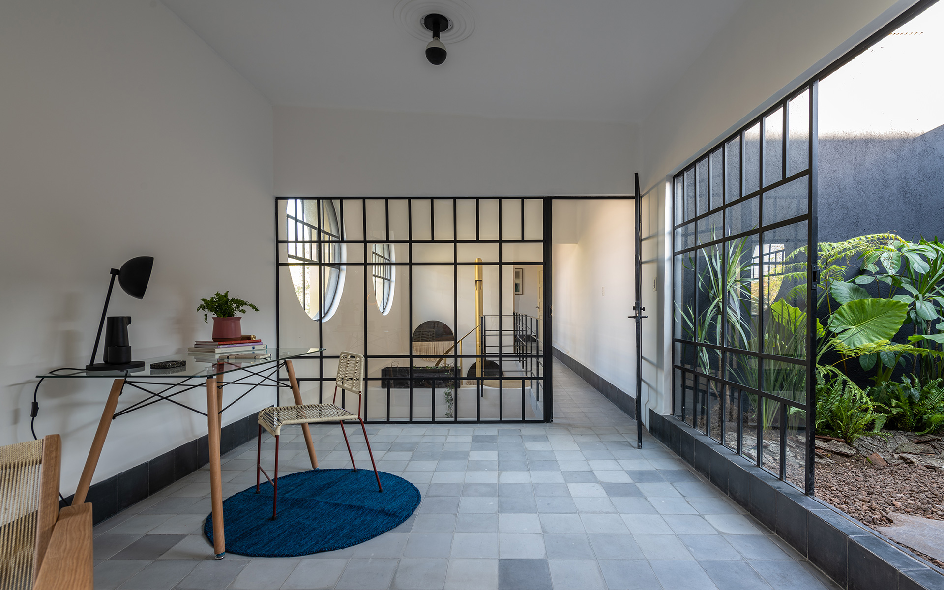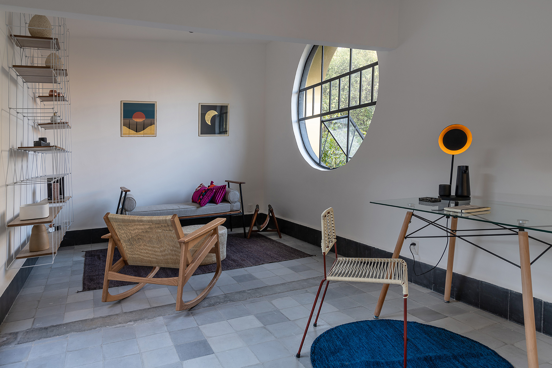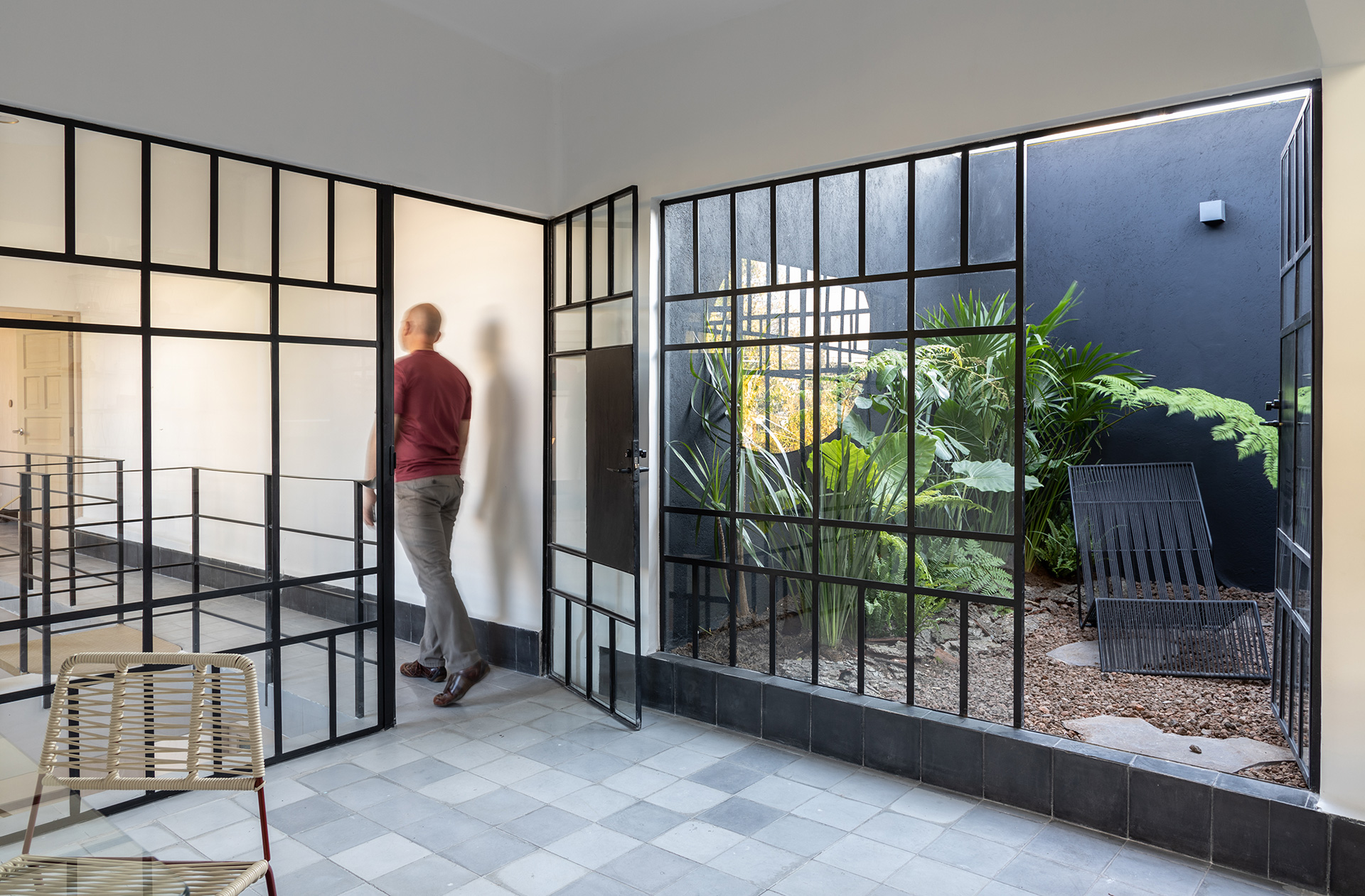Para dar identidad y carácter a los interiores, el mobiliario se seleccionó distinto para cada vivienda, complementando los pisos de pasta de colores en contraste con los tonos blancos y negros de los muros y patios. Para esto se usaron muebles de diseño artesanal mexicano contemporaneo.