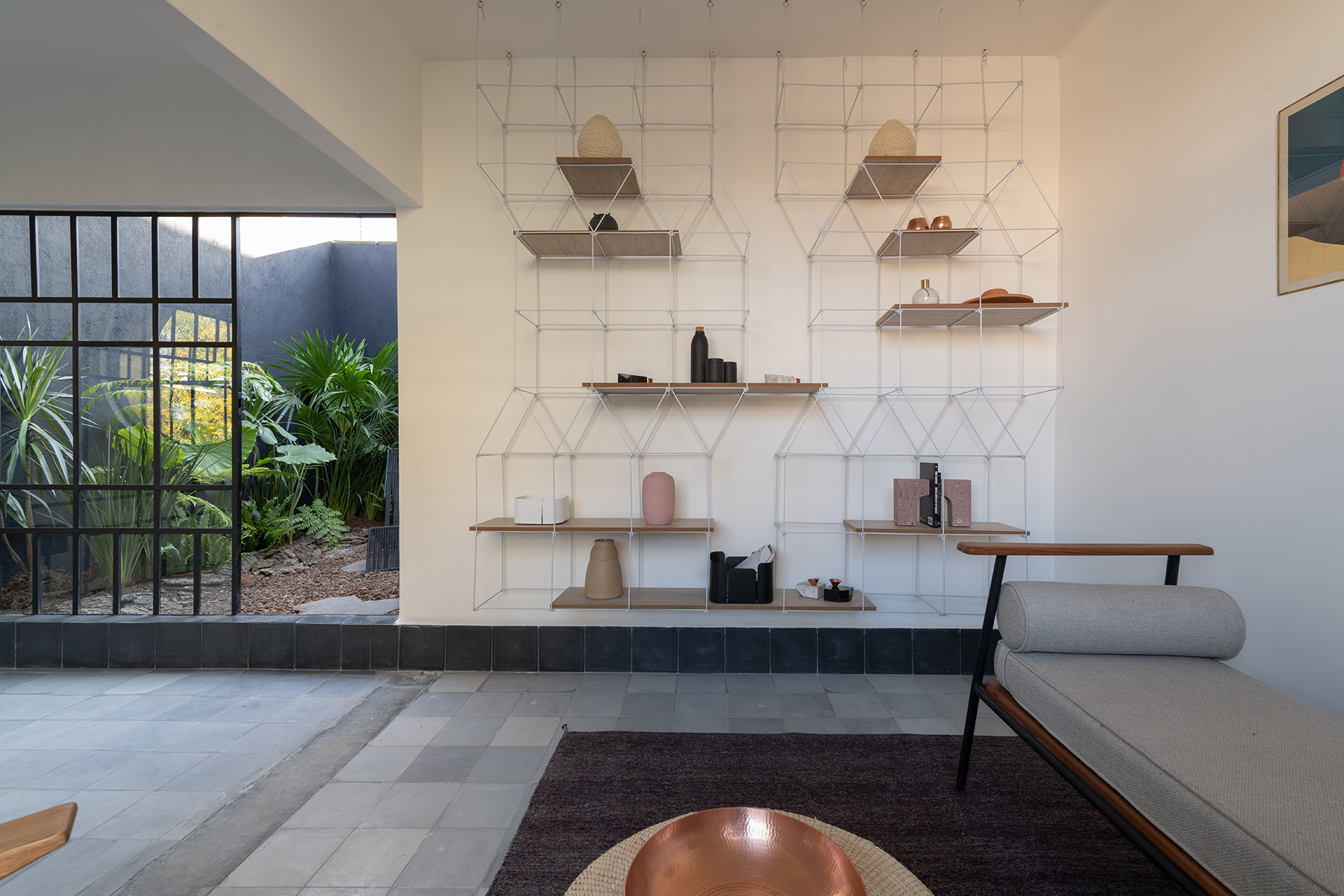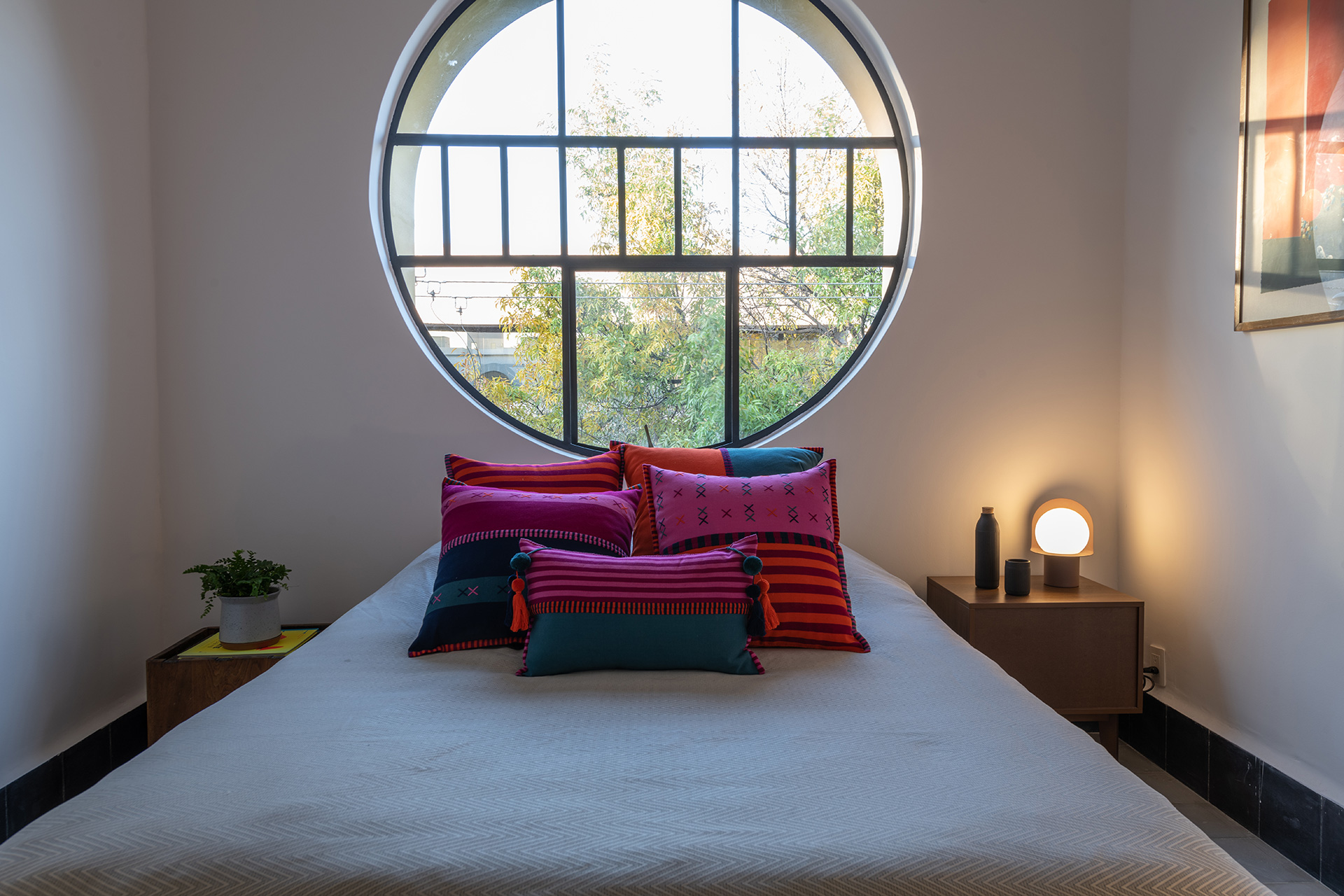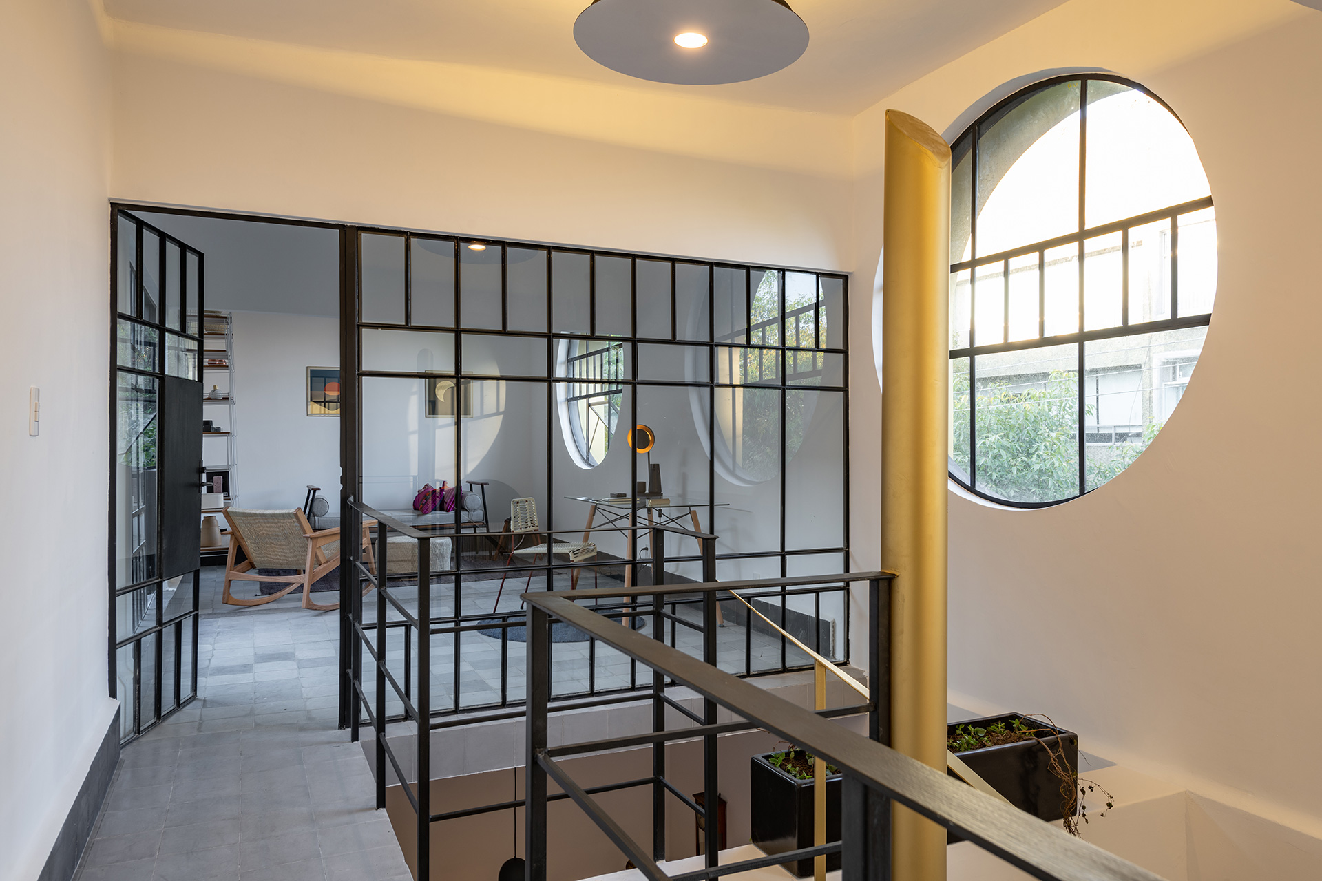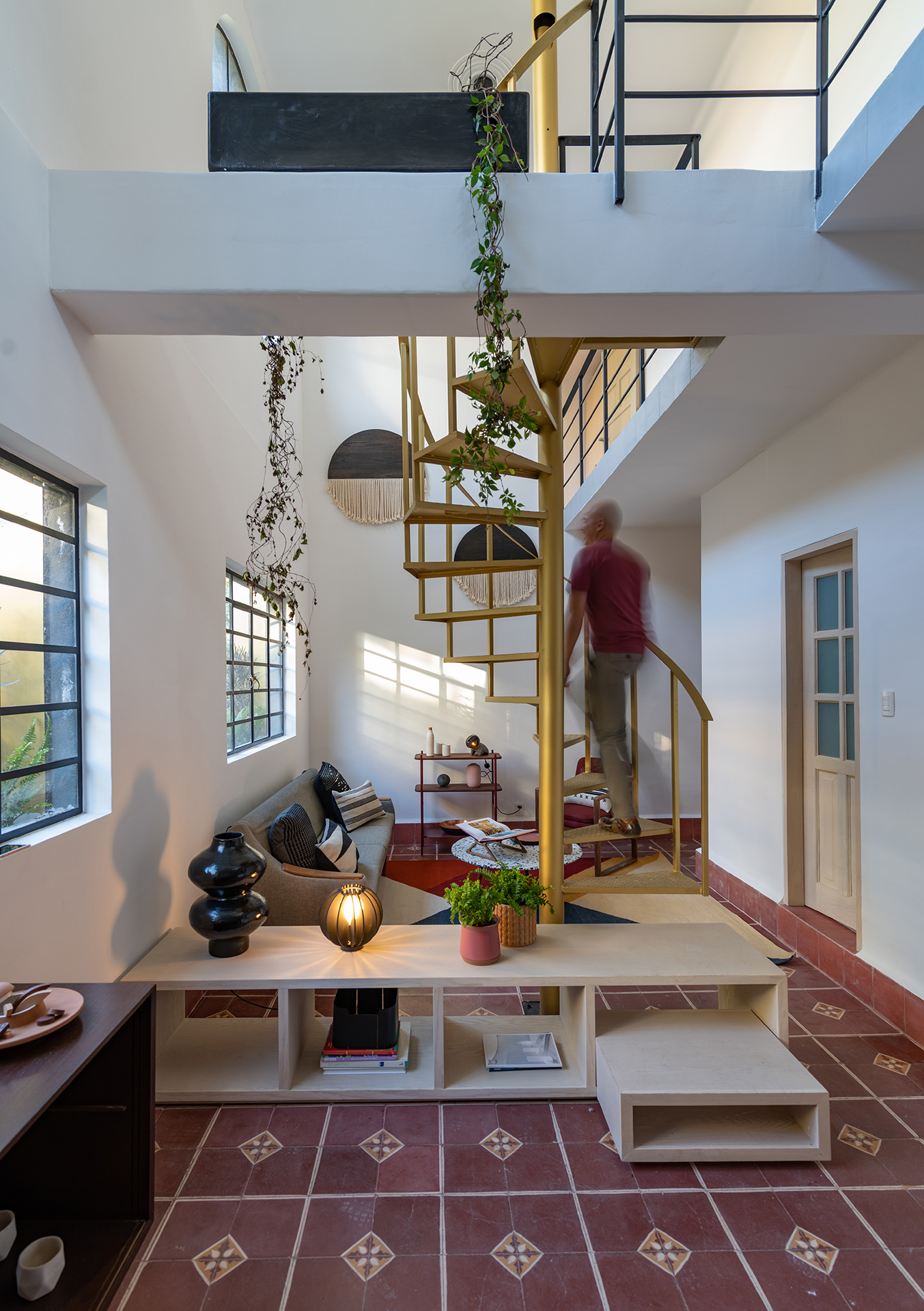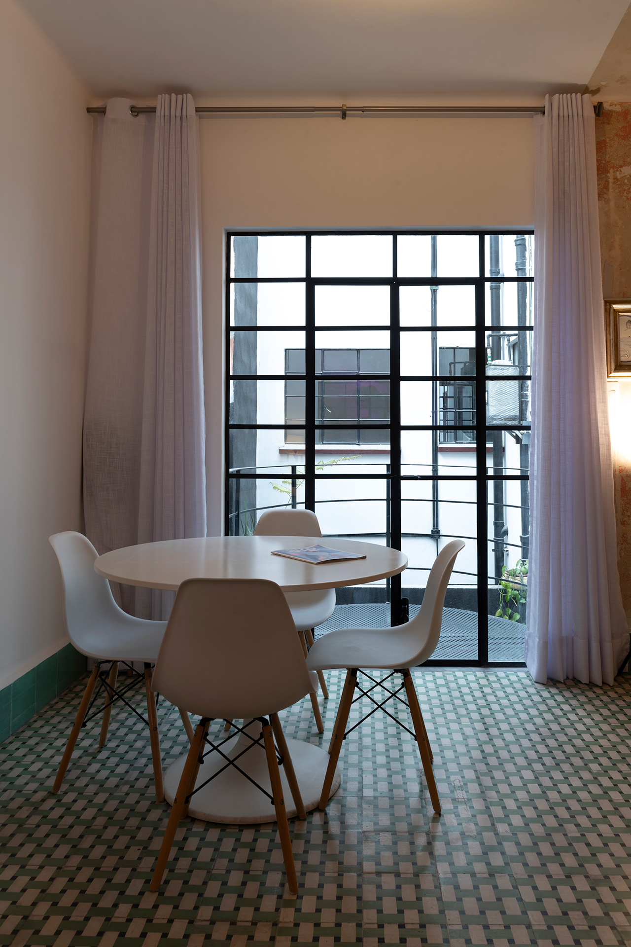 Para dar identidad y carácter a los interiores, el mobiliario se seleccionó distinto para cada vivienda, complementando los pisos de pasta de colores en contraste con los tonos blancos y negros de los muros y patios. Para esto se usaron muebles de diseño artesanal mexicano contemporaneo.