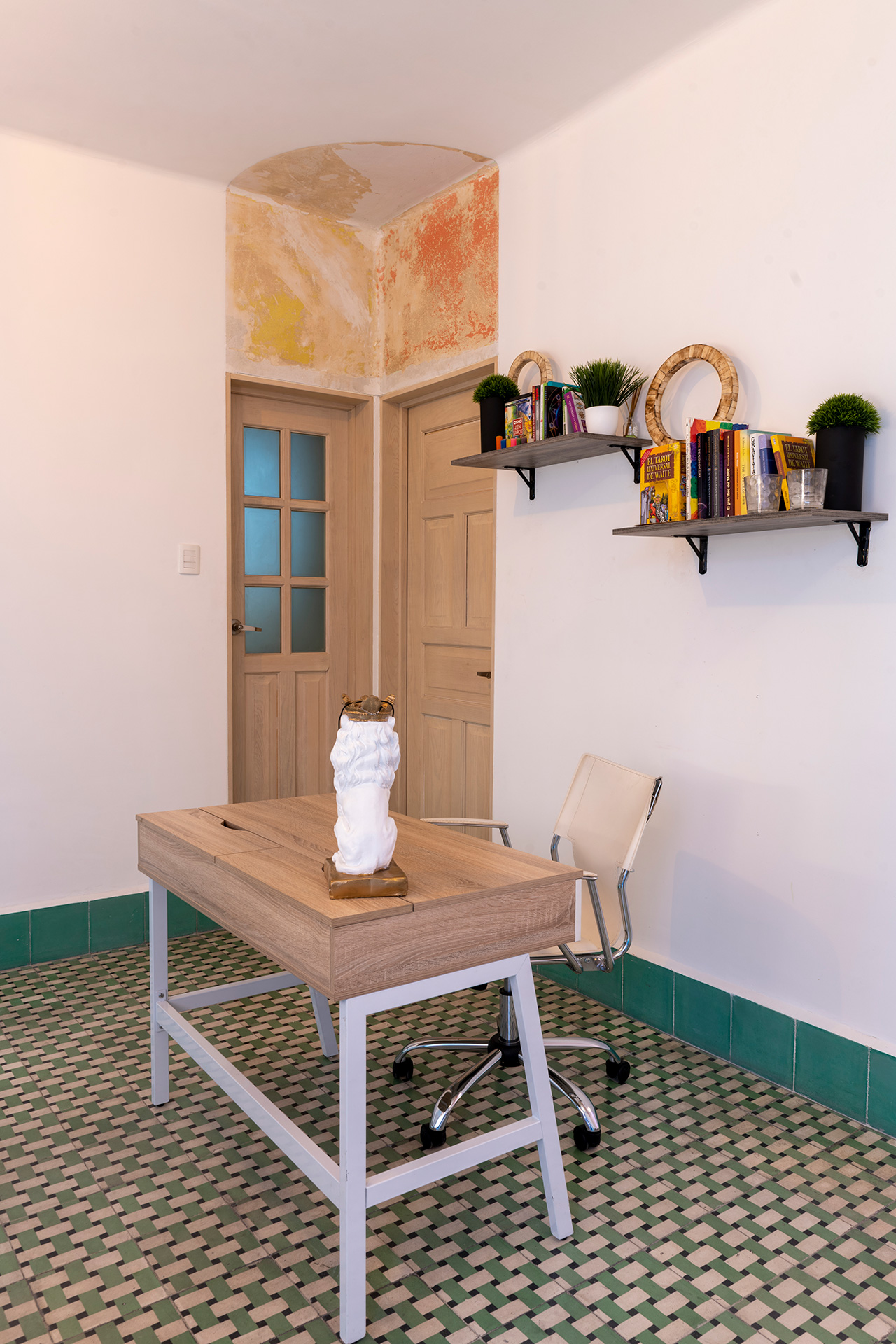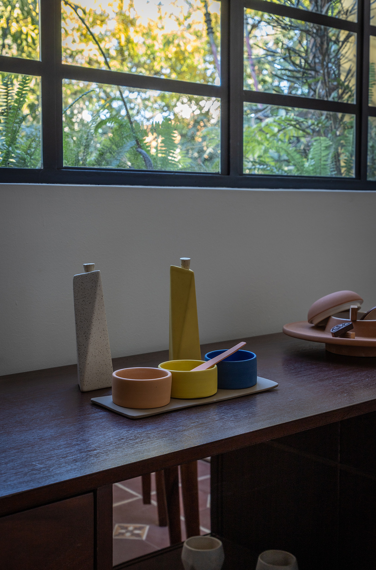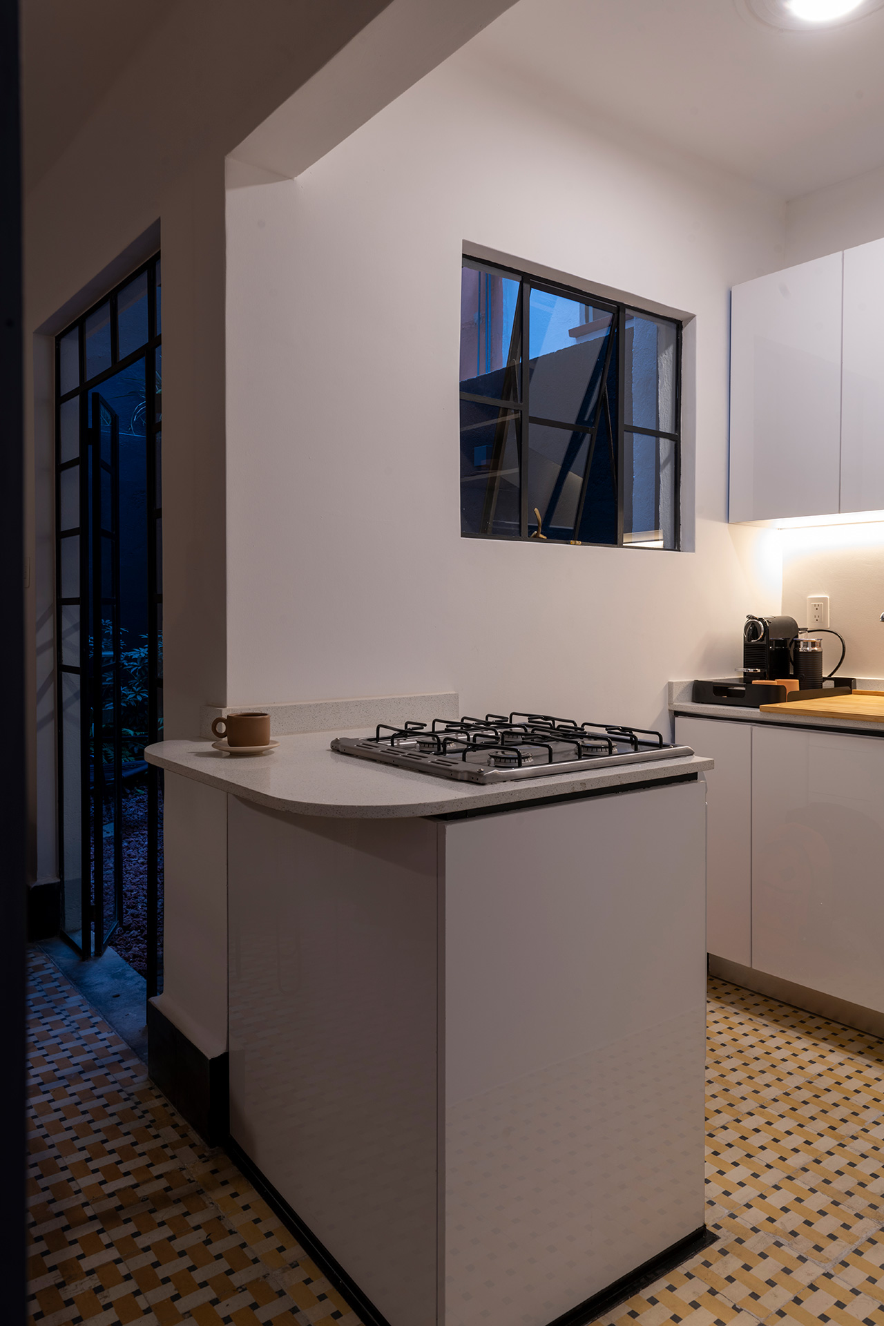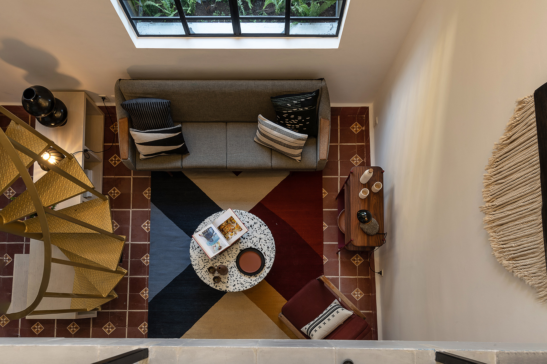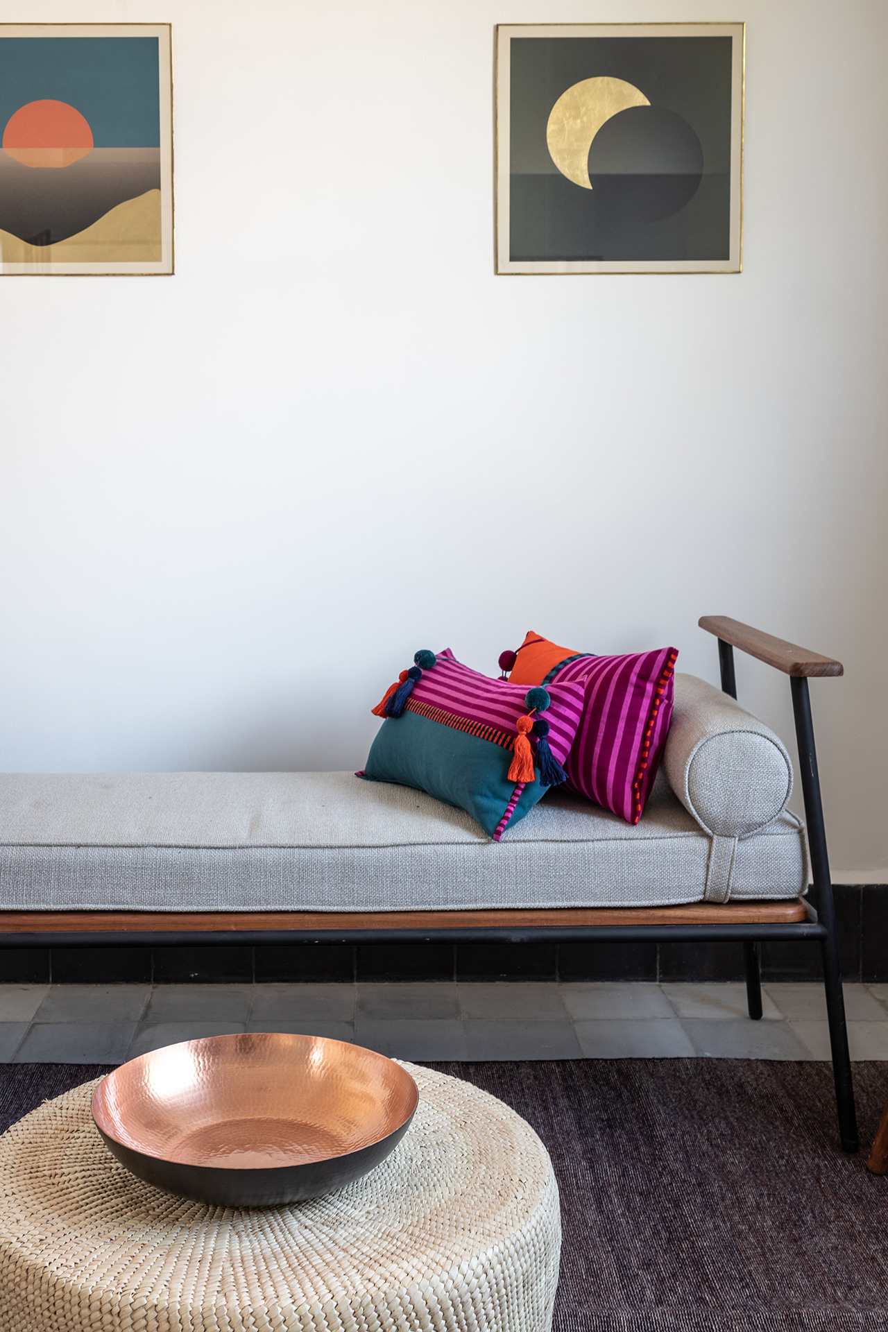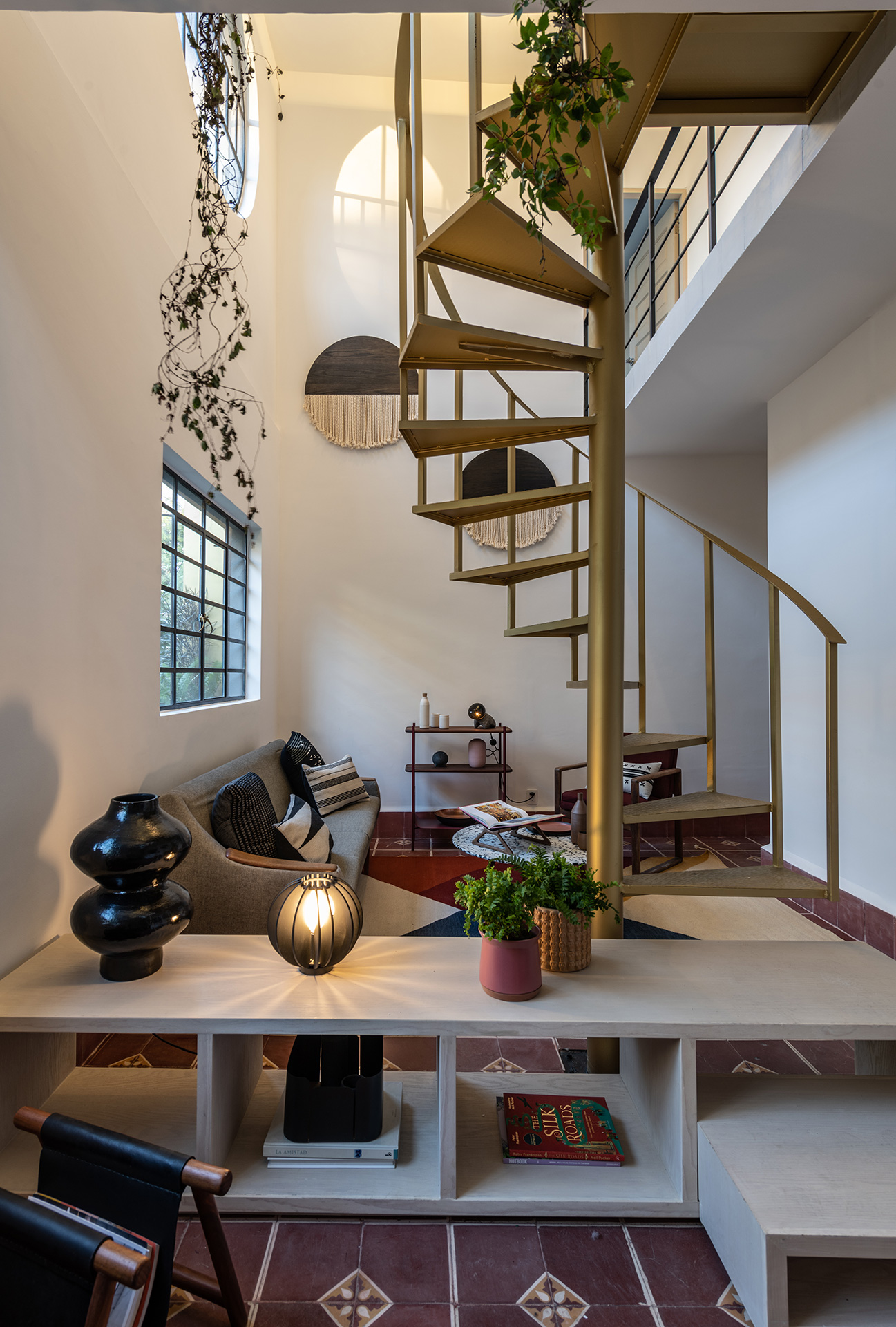 Para dar identidad y carácter a los interiores, el mobiliario se seleccionó distinto para cada vivienda, complementando los pisos de pasta de colores en contraste con los tonos blancos y negros de los muros y patios. Para esto se usaron muebles de diseño artesanal mexicano contemporaneo.