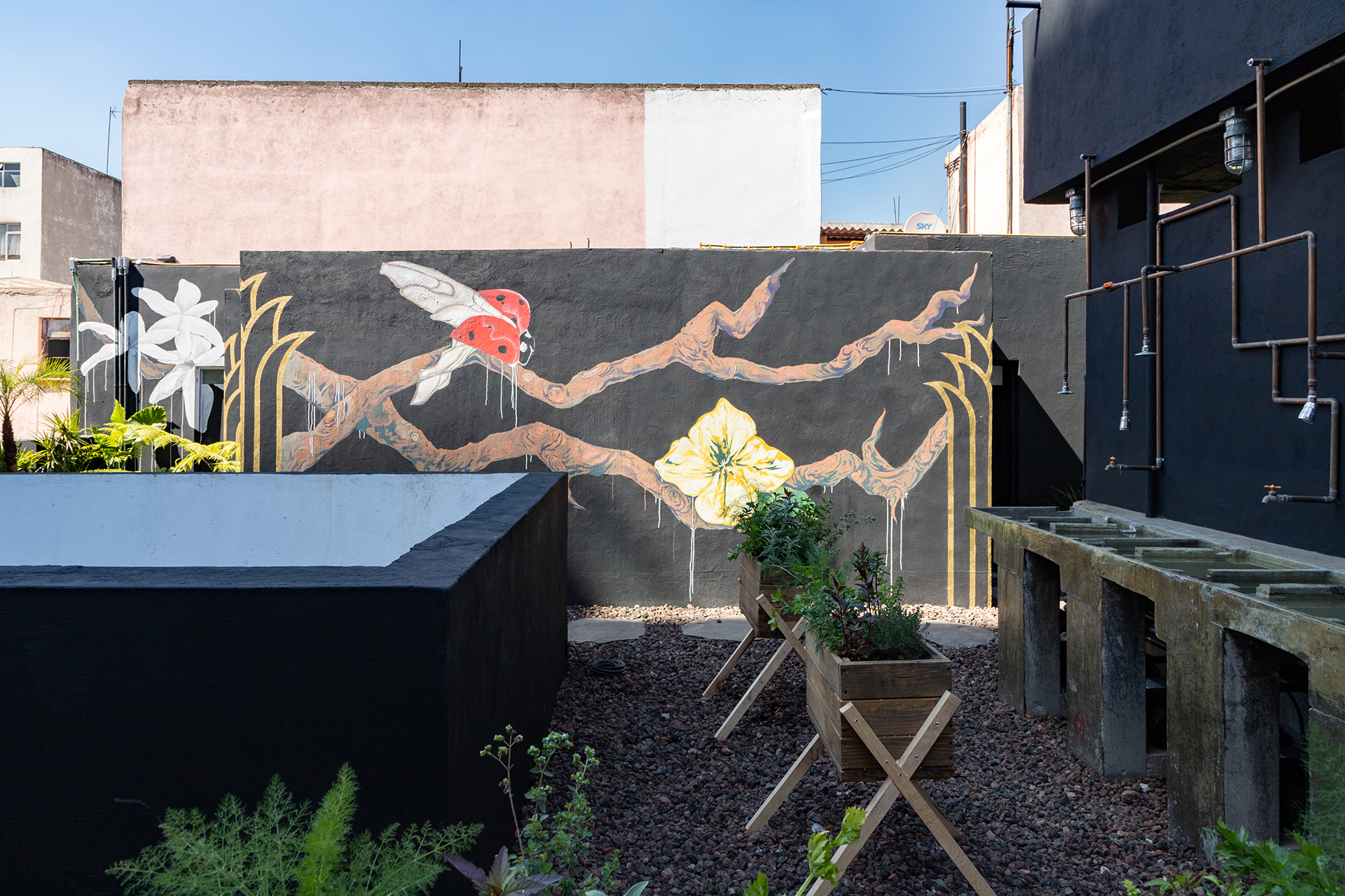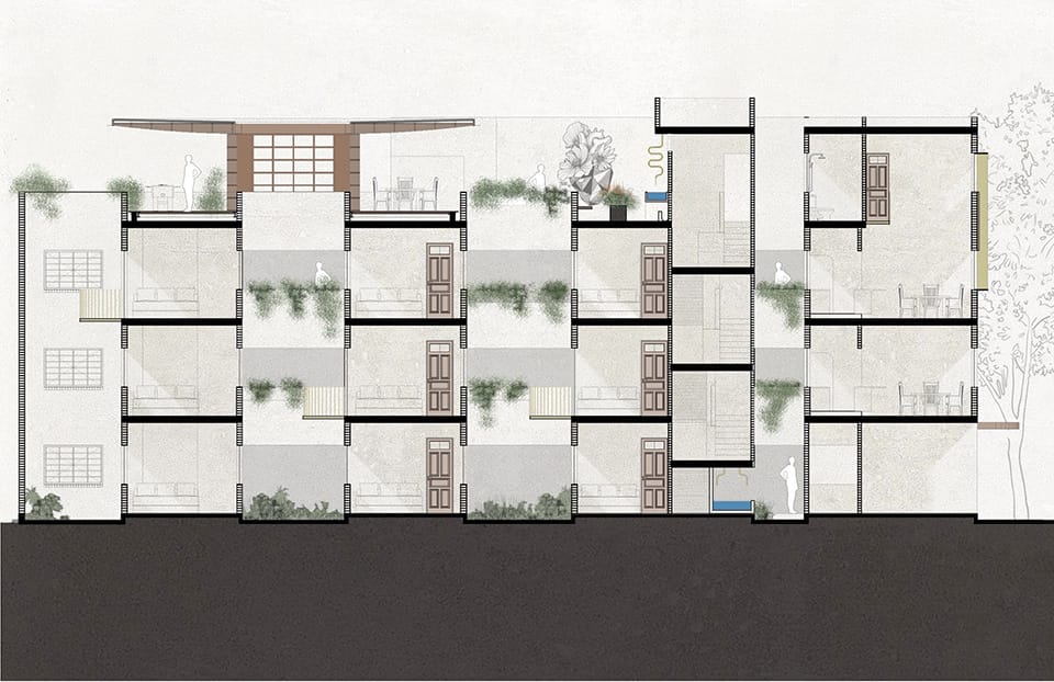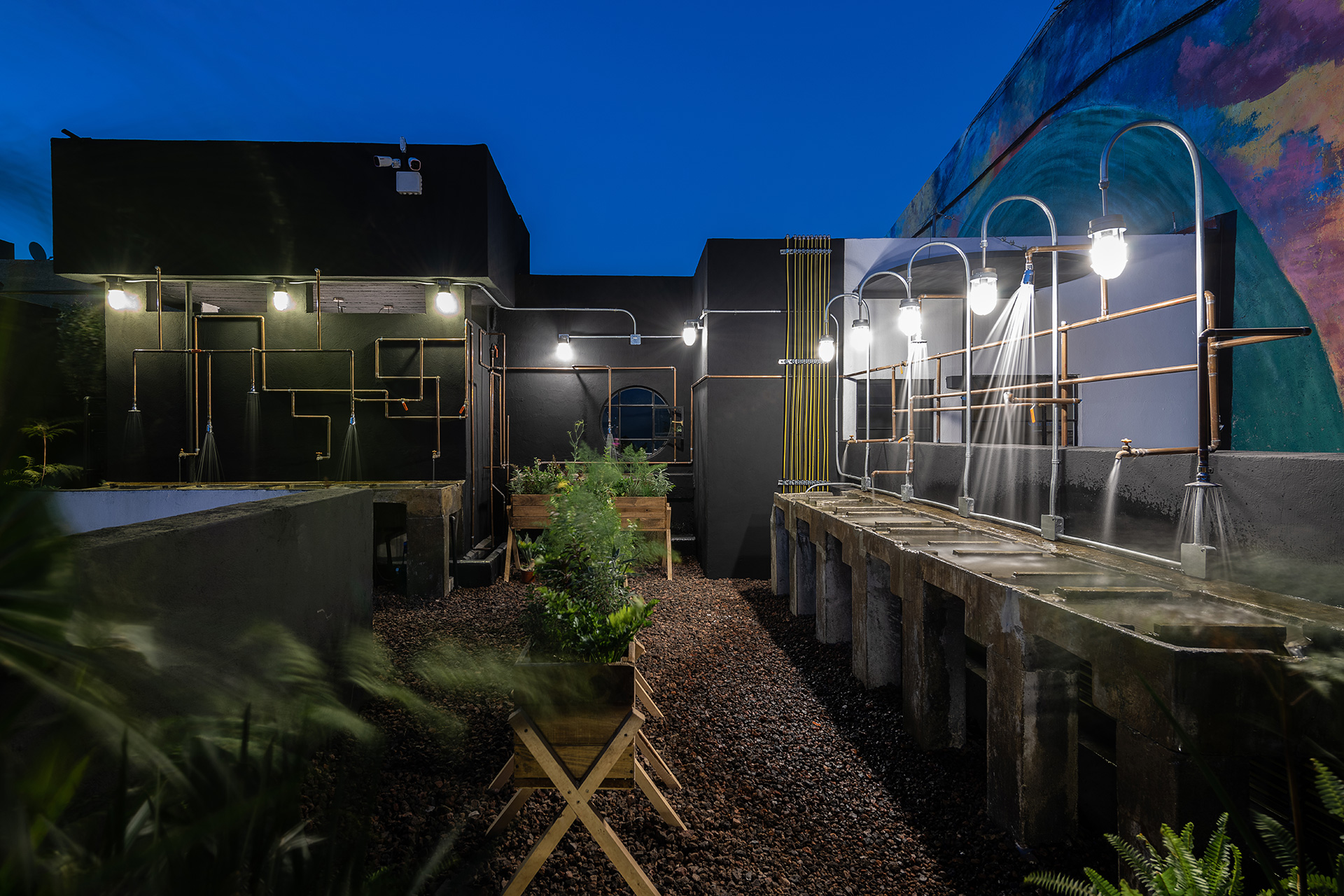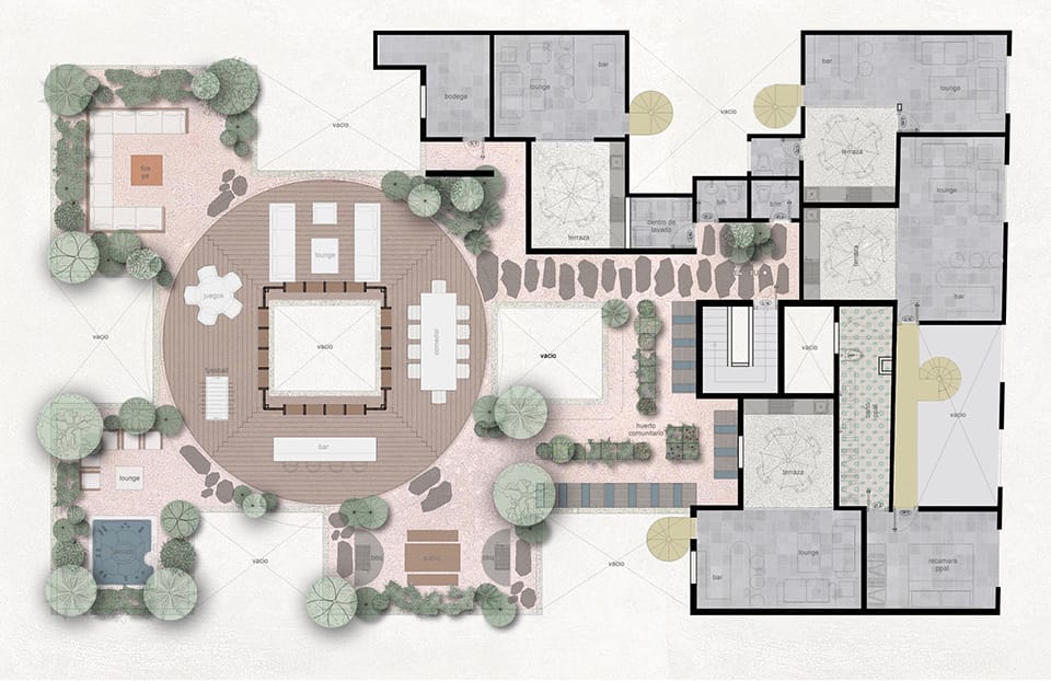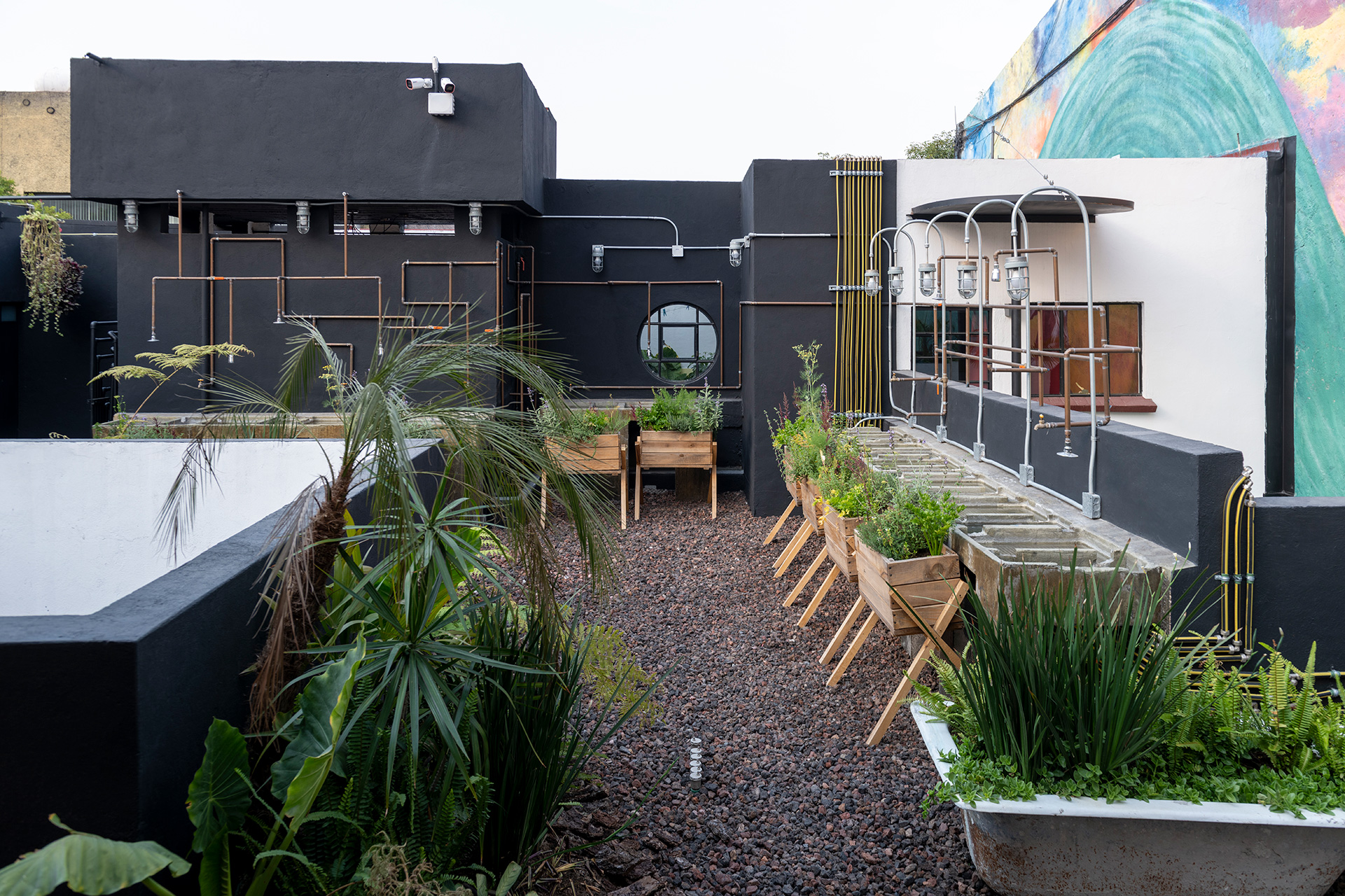 La azotea se convirtió en el área protagónica del edificio, transformando lo que eran los lavaderos y tendederos en un jardín comunitario para los nuevos residentes con un programa diverso que incluye: huerto urbano, asadores, un jacuzzi un área de juegos, una sala exterior, un bar y una fuente.