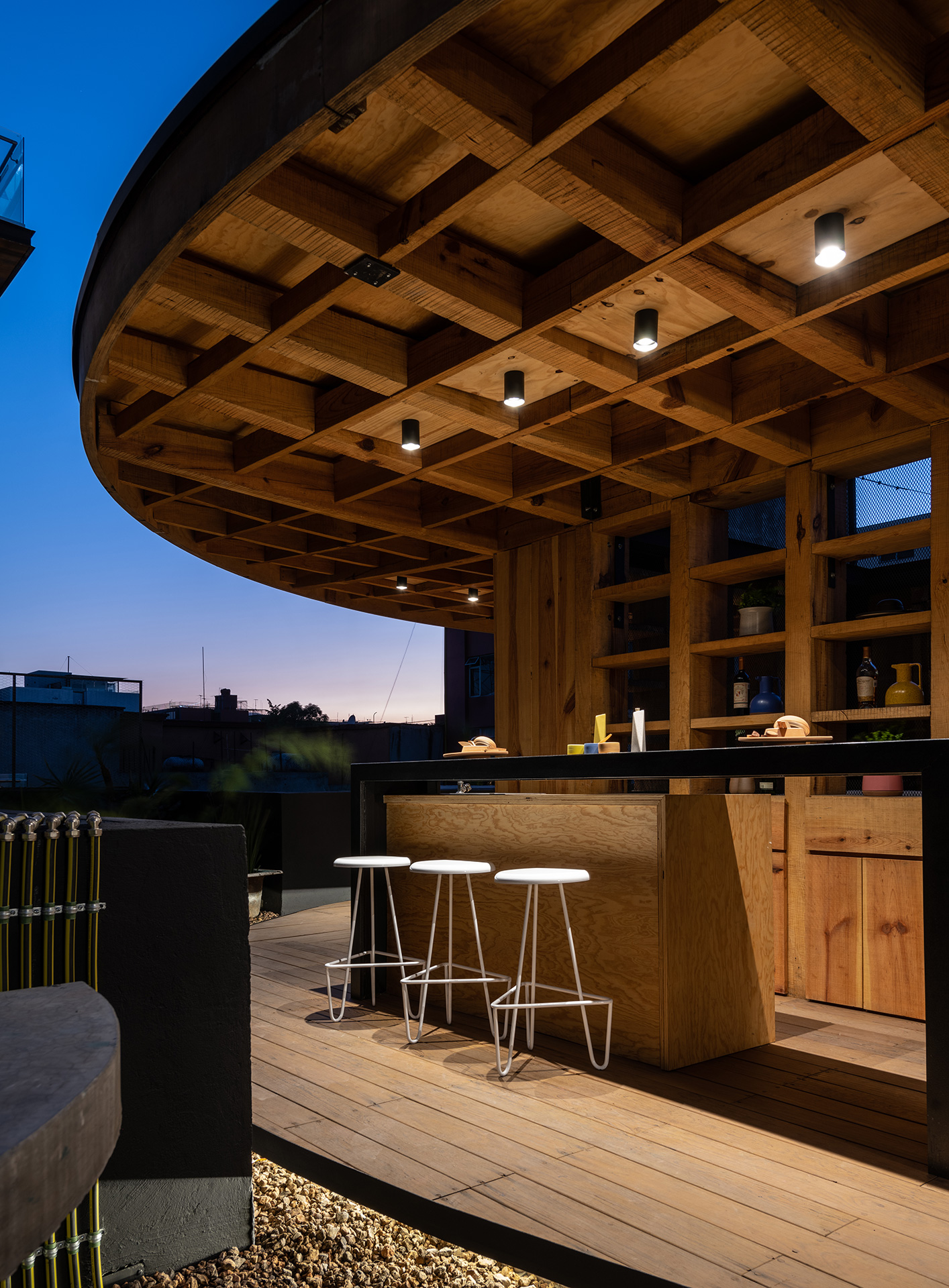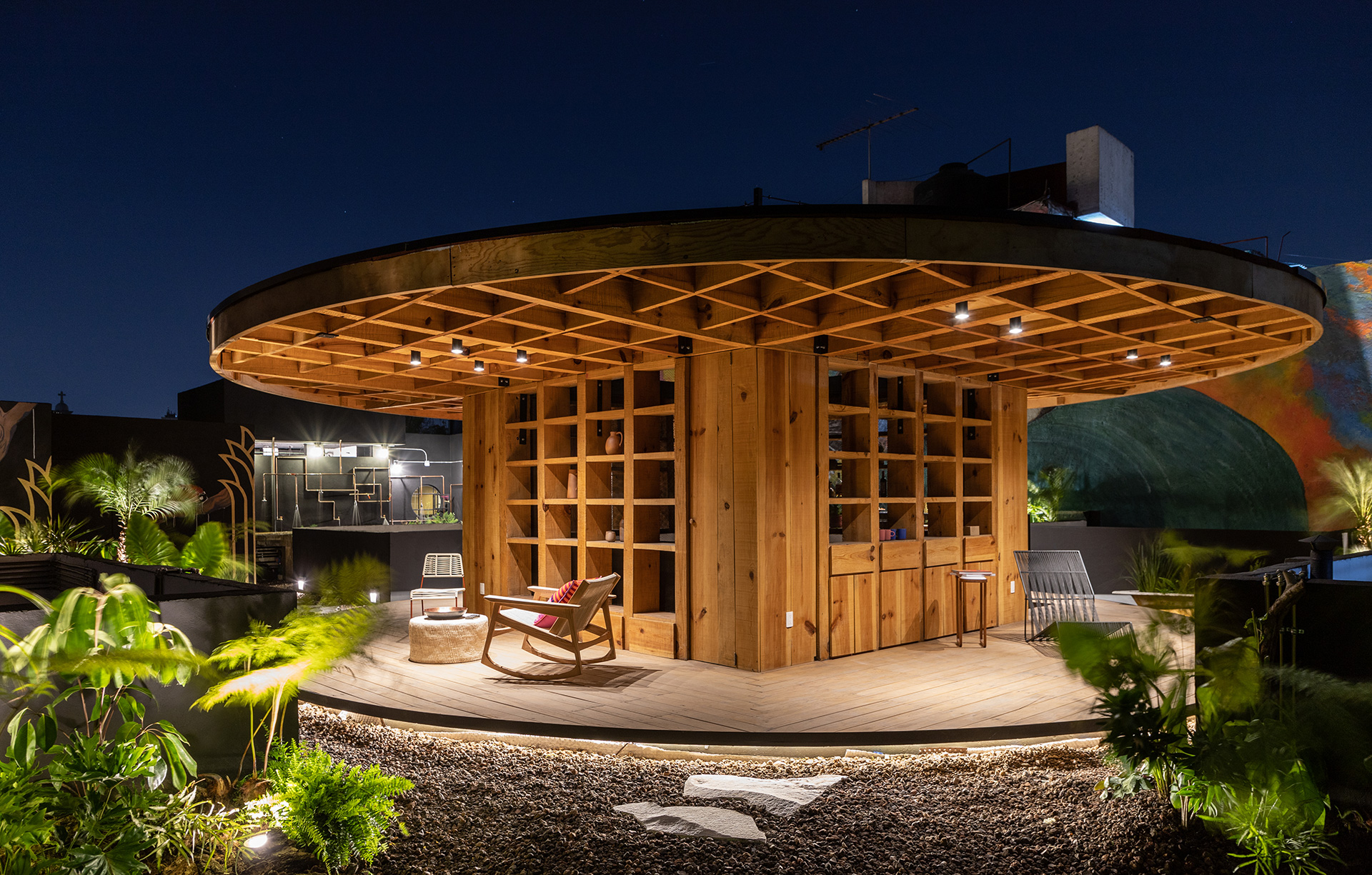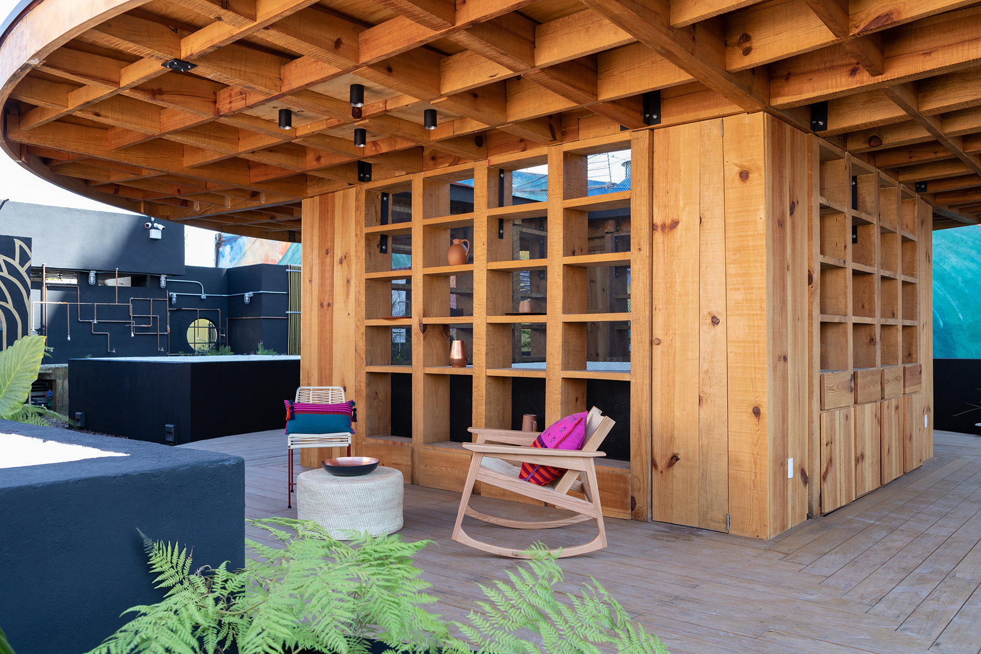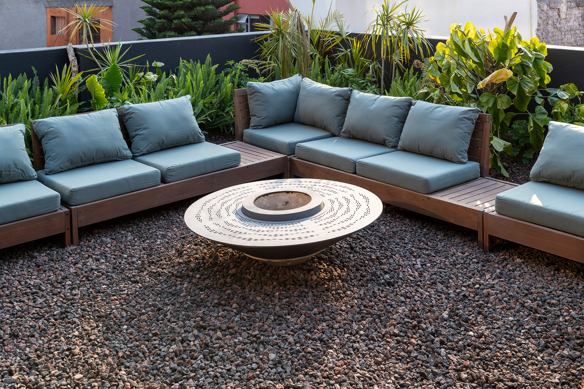 La azotea se convirtió en el área protagónica del edificio, transformando lo que eran los lavaderos y tendederos en un jardín comunitario para los nuevos residentes con un programa diverso que incluye: huerto urbano, asadores, un jacuzzi un área de juegos, una sala exterior, un bar y una fuente.
