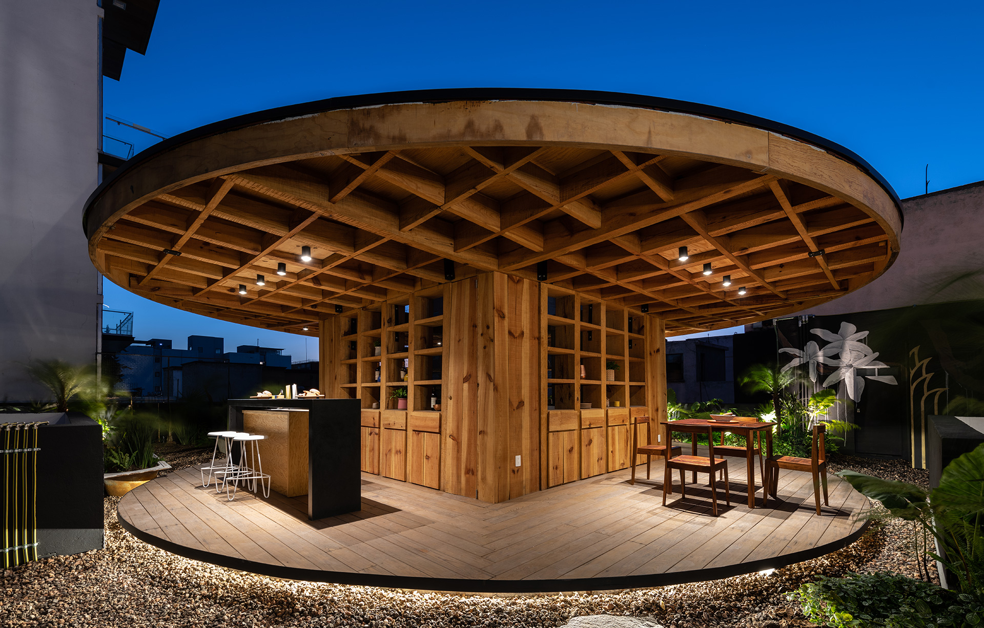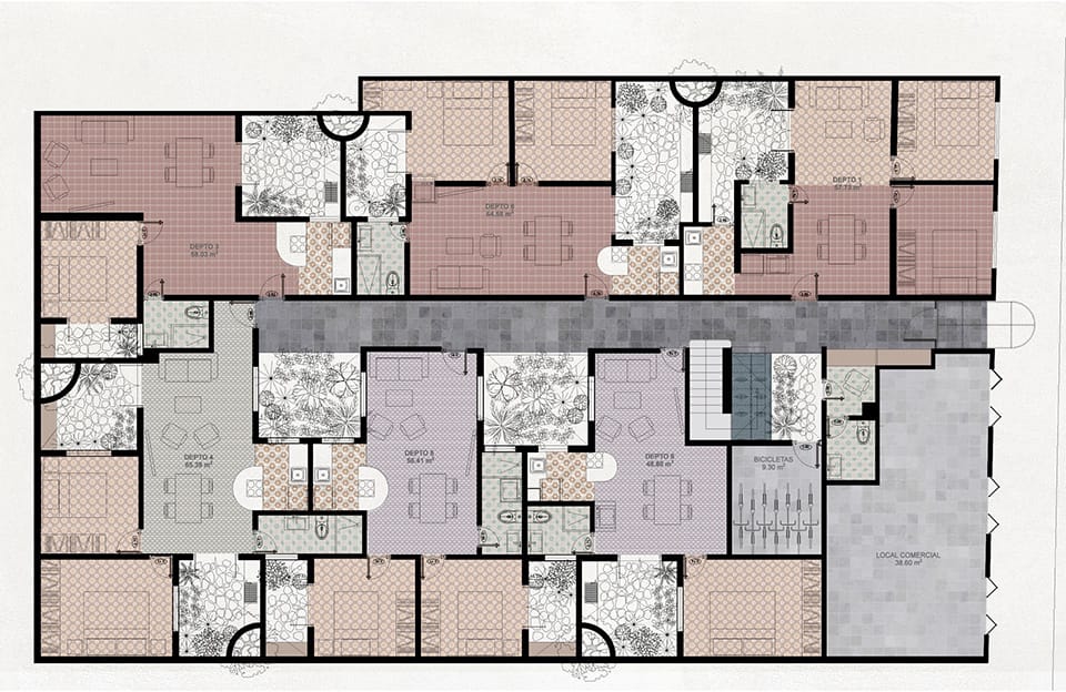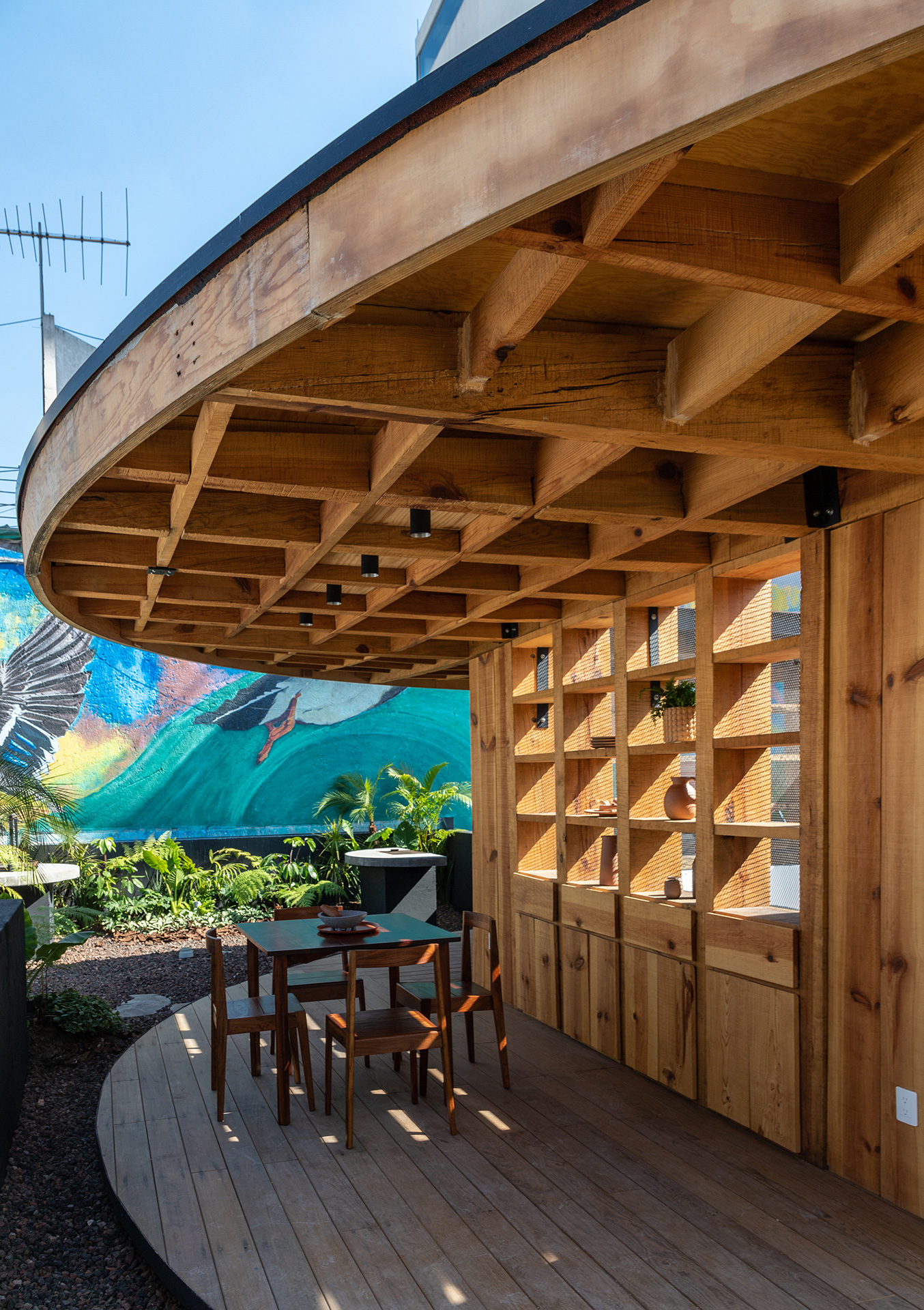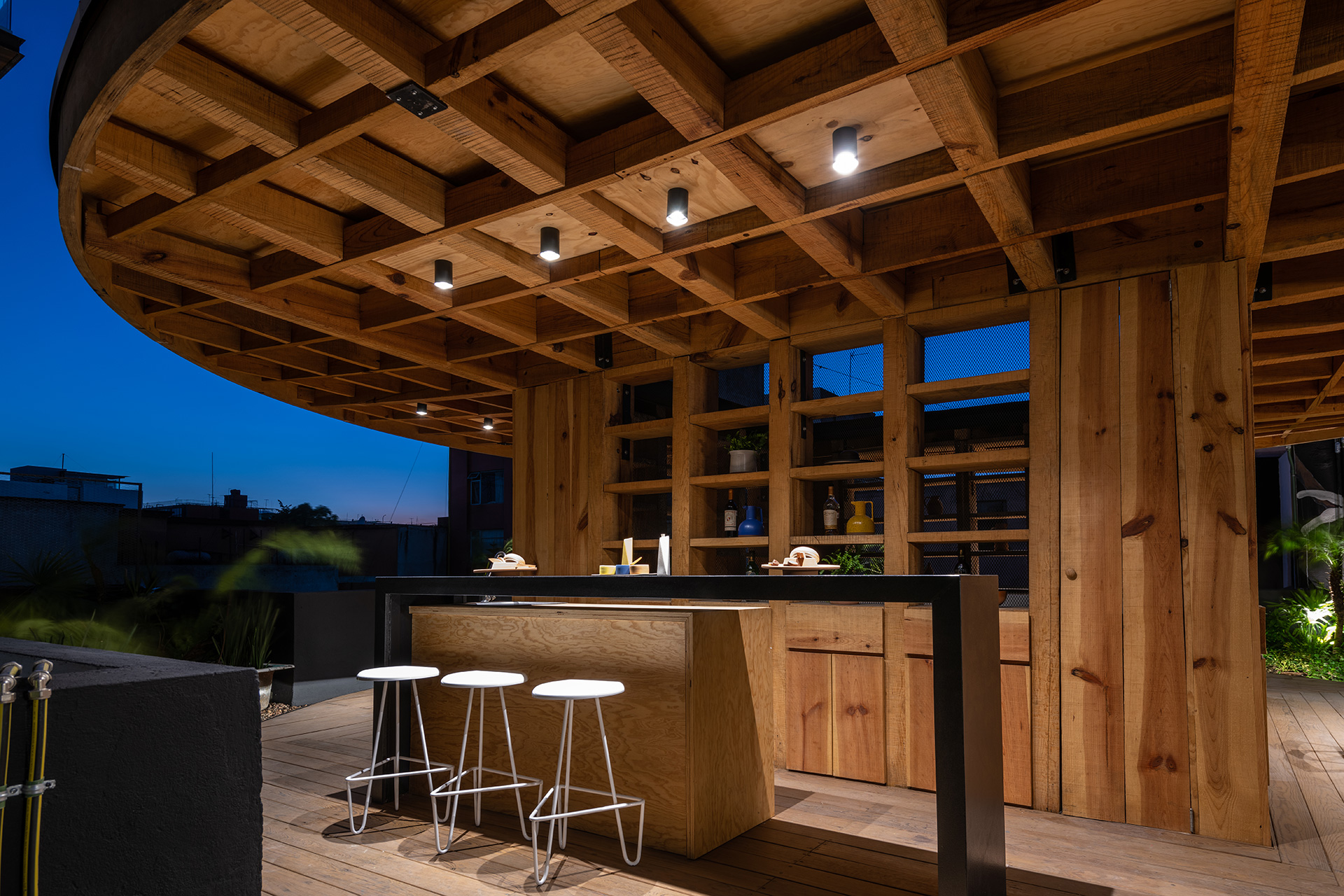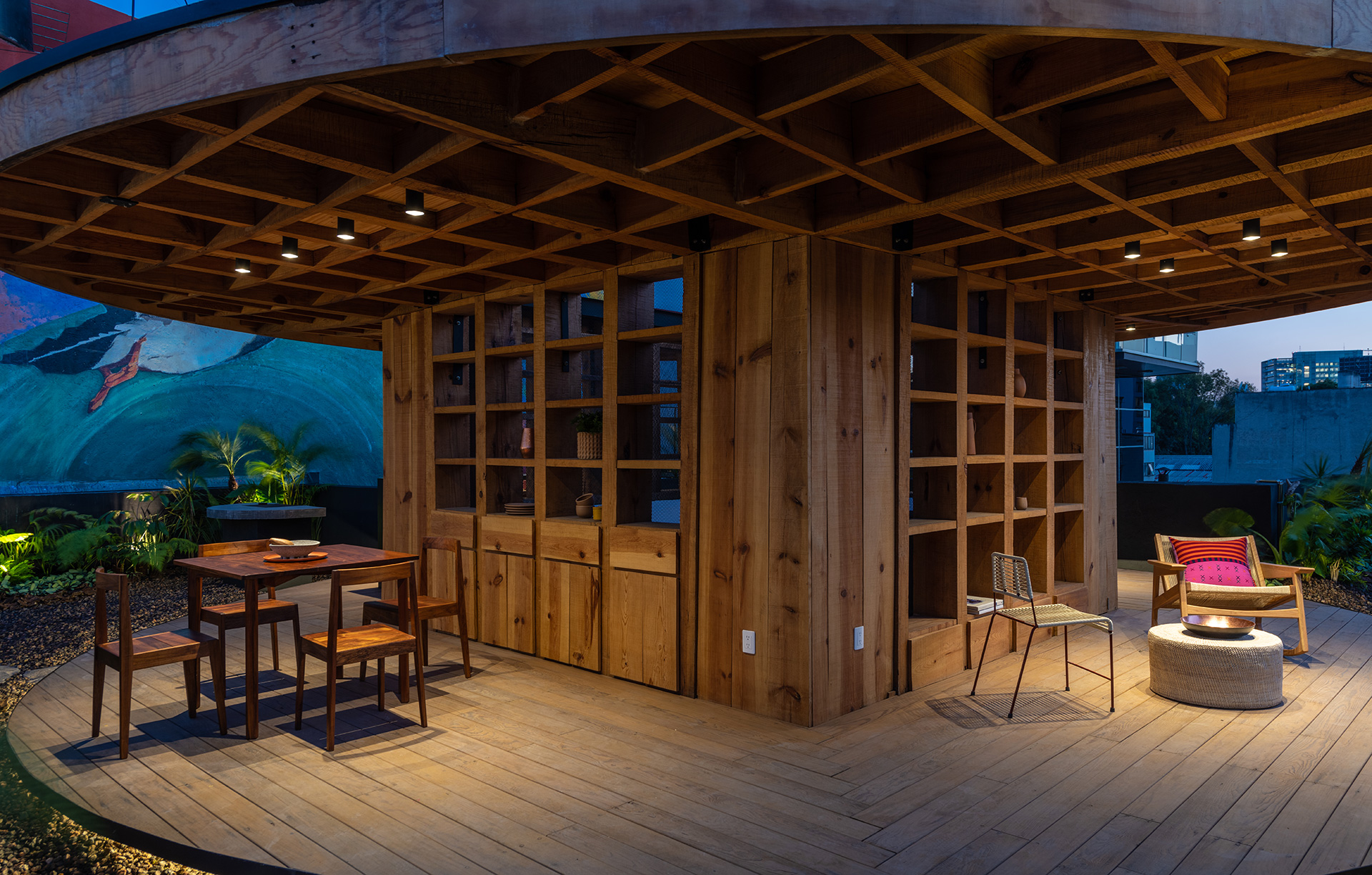 La azotea se convirtió en el área protagónica del edificio, transformando lo que eran los lavaderos y tendederos en un jardín comunitario para los nuevos residentes con un programa diverso que incluye: huerto urbano, asadores, un jacuzzi un área de juegos, una sala exterior, un bar y una fuente.