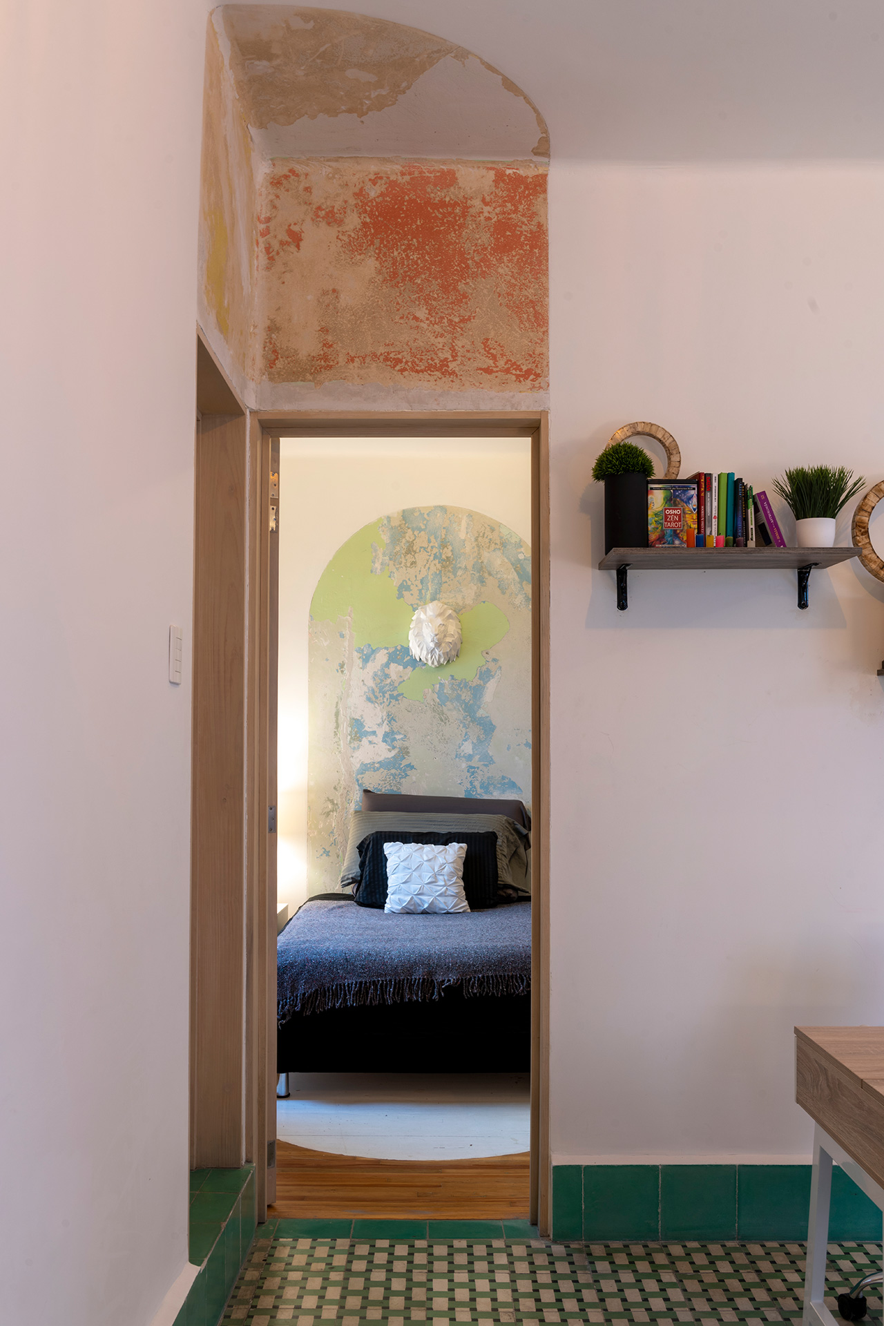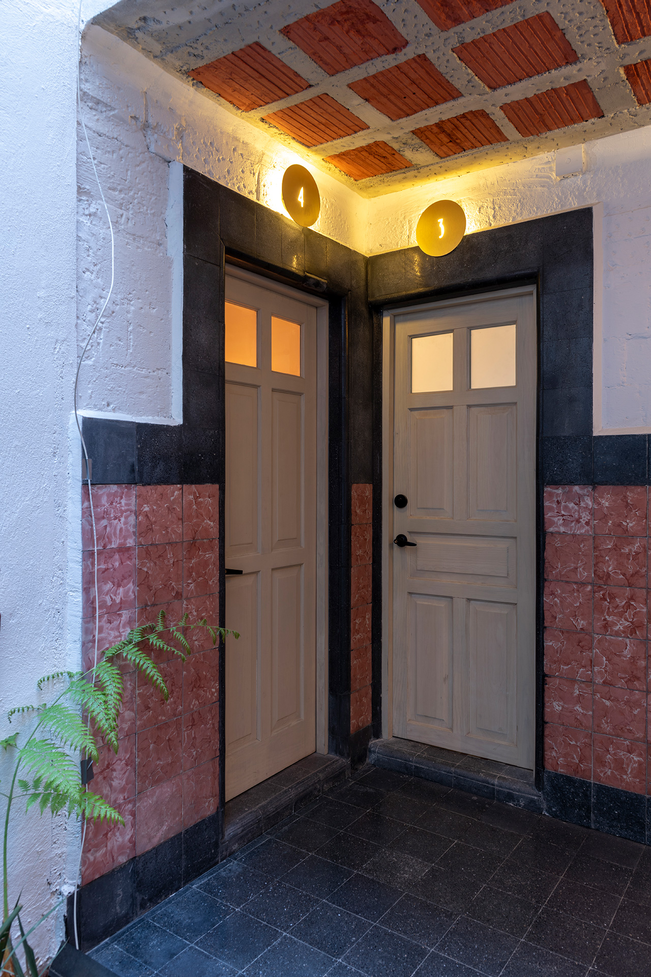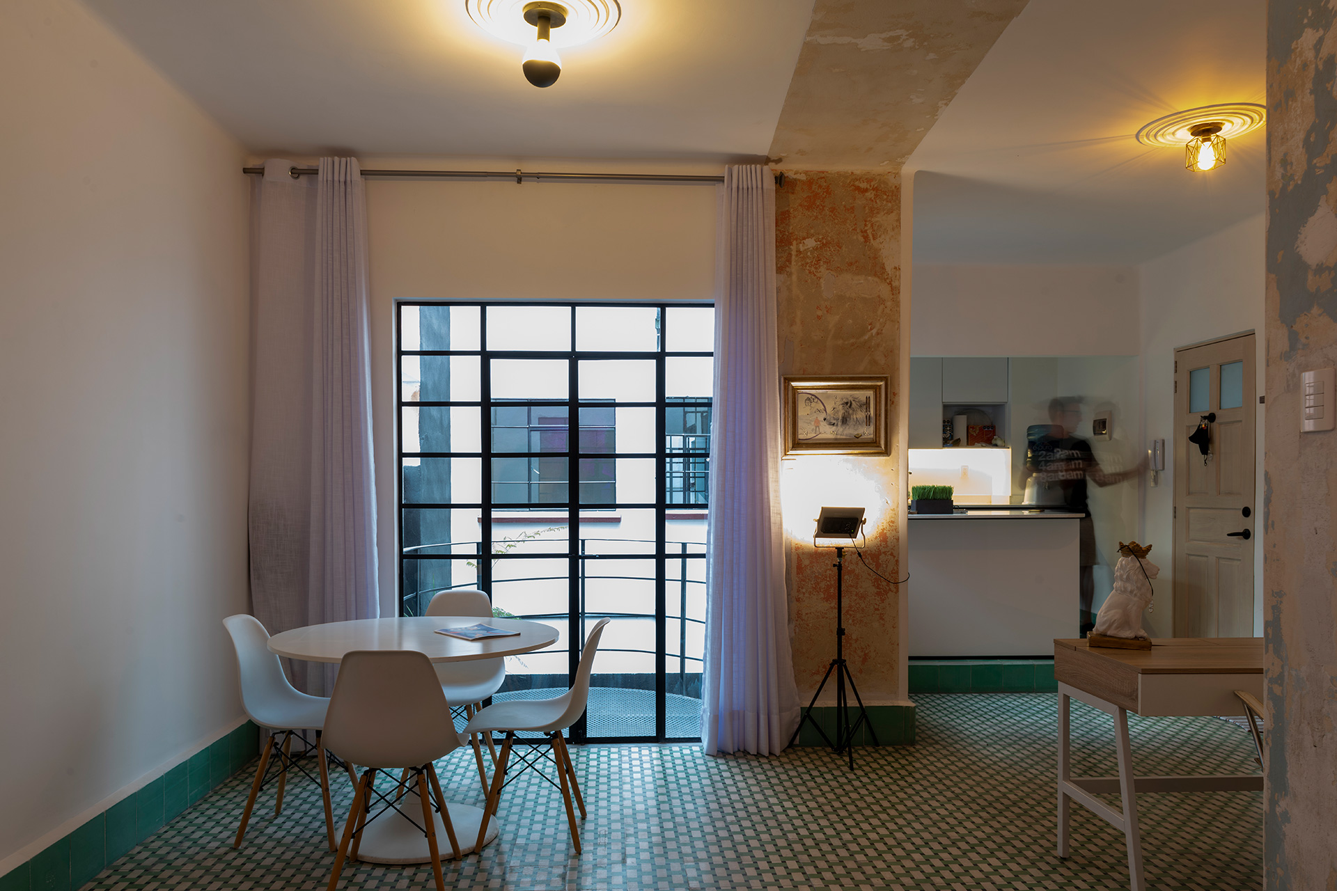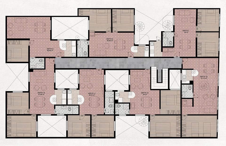 Durante la intervención se respetó el estilo art decó del edificio, y se dejaron a la vista testigos en muros, losas y pisos que muestran el sistema constructivo y la historia de quienes lo habitaron, haciendo que éstos formen parte de la configuración de interiores y el resalten el amueblado. Se intervinieron puntualmente las cocinas, abriendolas al área social e integrando equipos del del habitar contemporáneo, tales como lavadoras, microondas y refrigeradores.