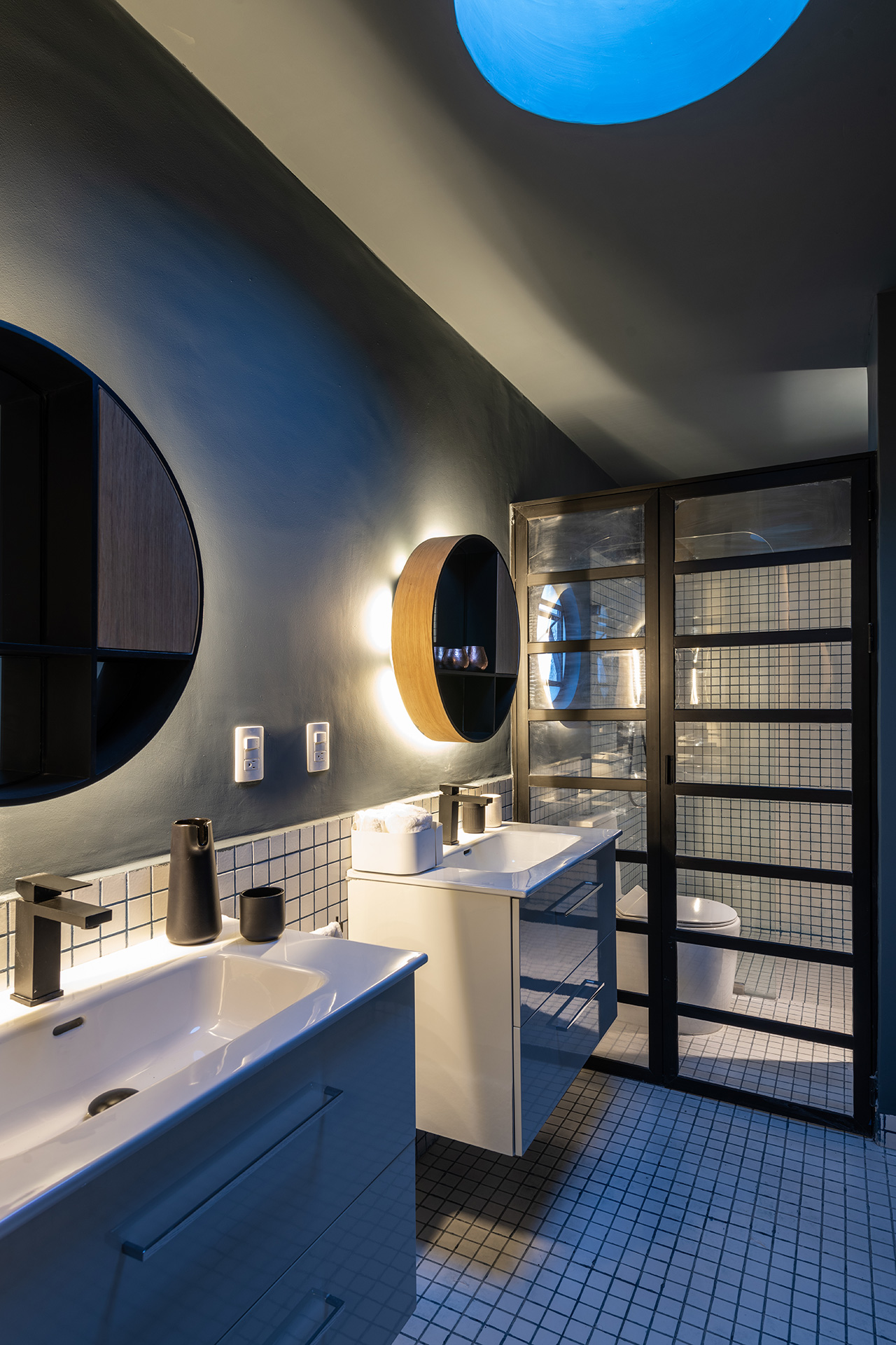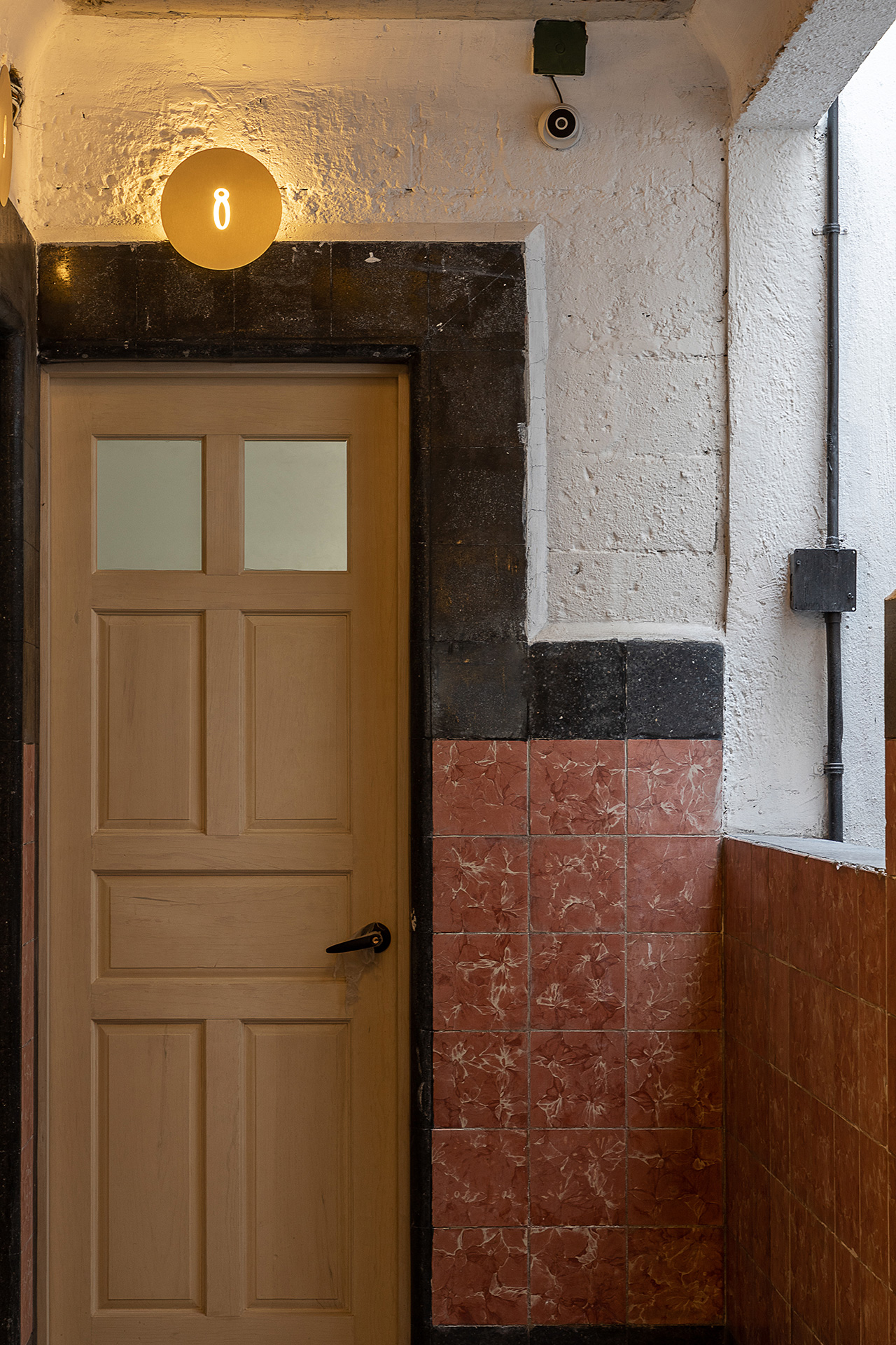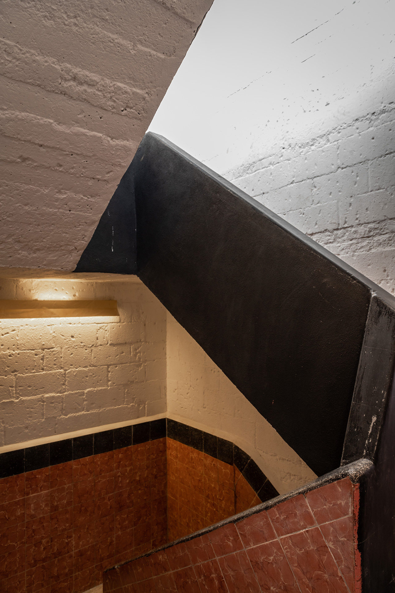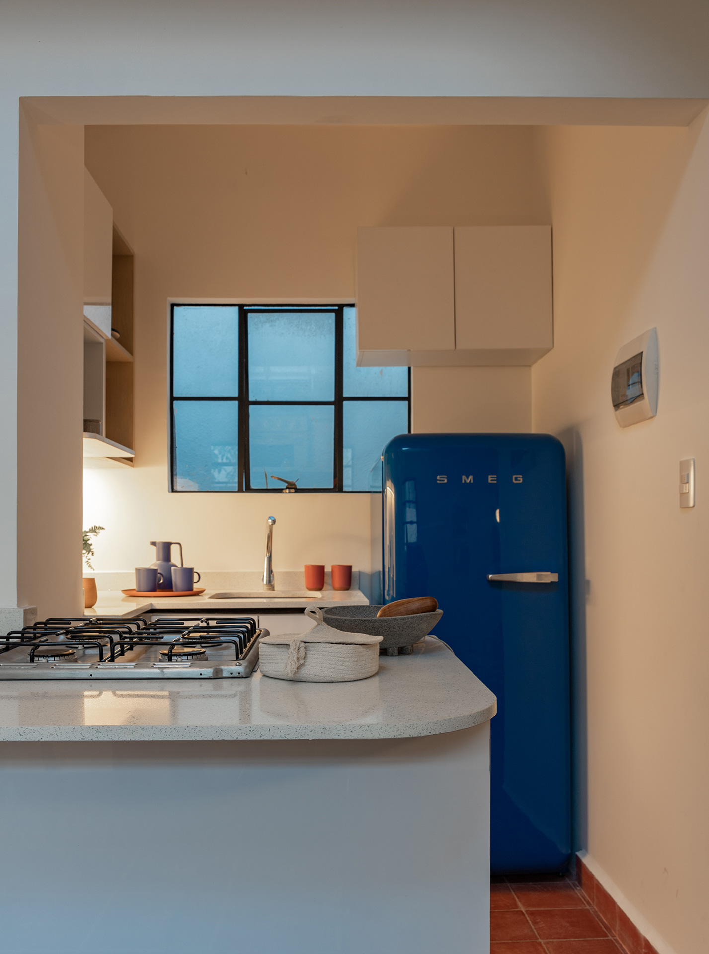 Durante la intervención se respetó el estilo art decó del edificio, y se dejaron a la vista testigos en muros, losas y pisos que muestran el sistema constructivo y la historia de quienes lo habitaron, haciendo que éstos formen parte de la configuración de interiores y el resalten el amueblado. Se intervinieron puntualmente las cocinas, abriendolas al área social e integrando equipos del del habitar contemporáneo, tales como lavadoras, microondas y refrigeradores.