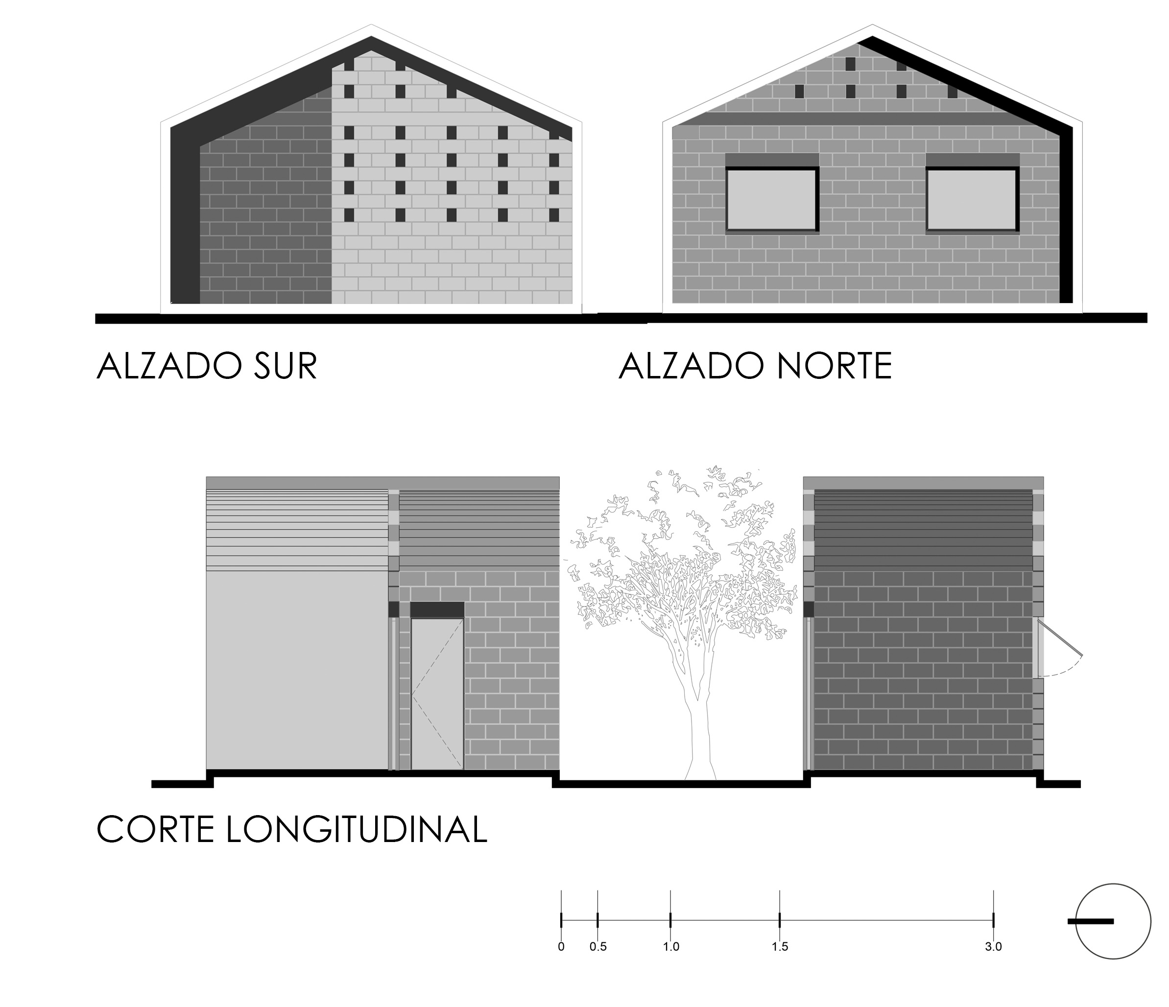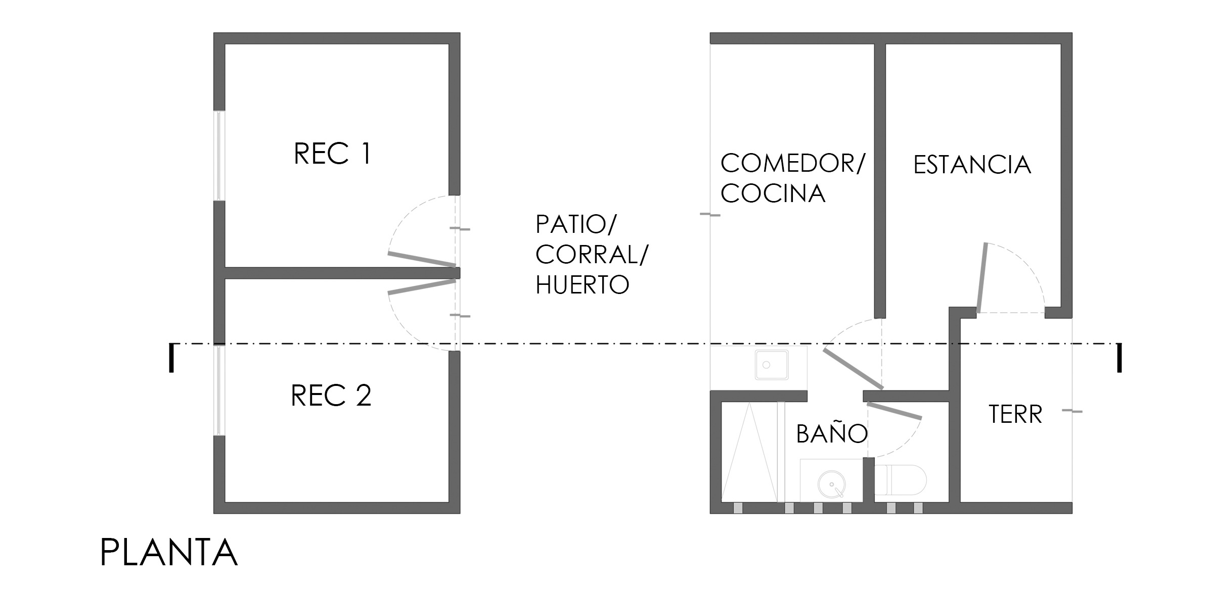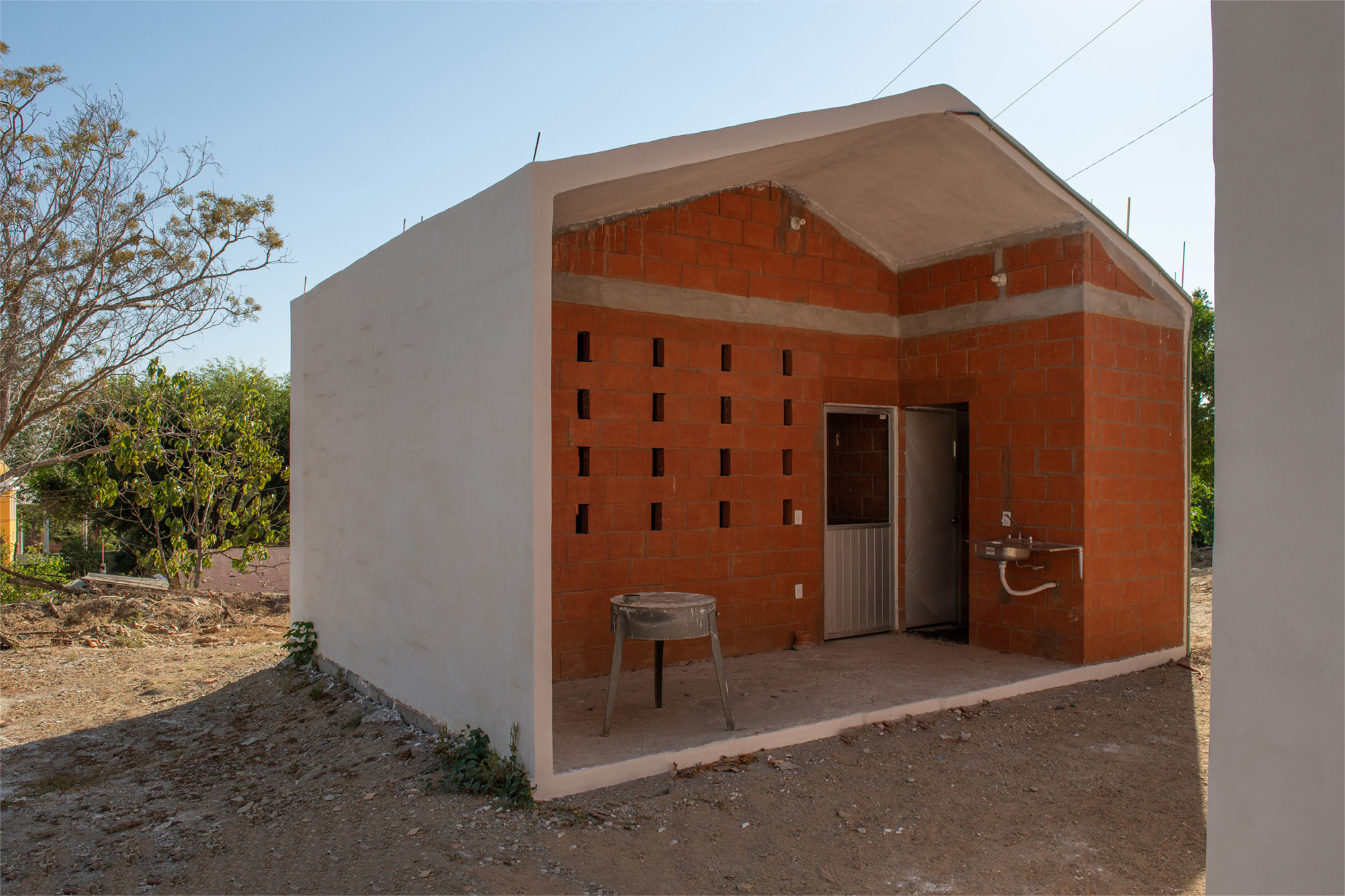 El vacío entre los dos edificios es un espacio abierto semi-privado que complementa el programa: se encuentran un área techada al aire libre para cocinar y comer, un baño que puede ser utilizado por tres personas al mismo tiempo pues tiene los usos divididos y un espacio sin pavimentar donde es posible sembrar un pequeño huerto o acorralar animales de granja como gallinas y cerdos. Este espacio también brinda potencial de crecimiento si es requerido por los usuarios. Los materiales fueron escogidos por su disponibilidad y precio, tabique prefabricado de barro para muros y concreto para la envolvente; en la envolvente la pintura blanca refleja los rayos del sol y está mezclada con impermeabilizante.