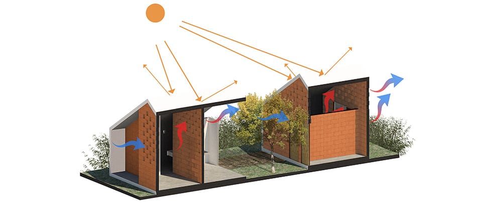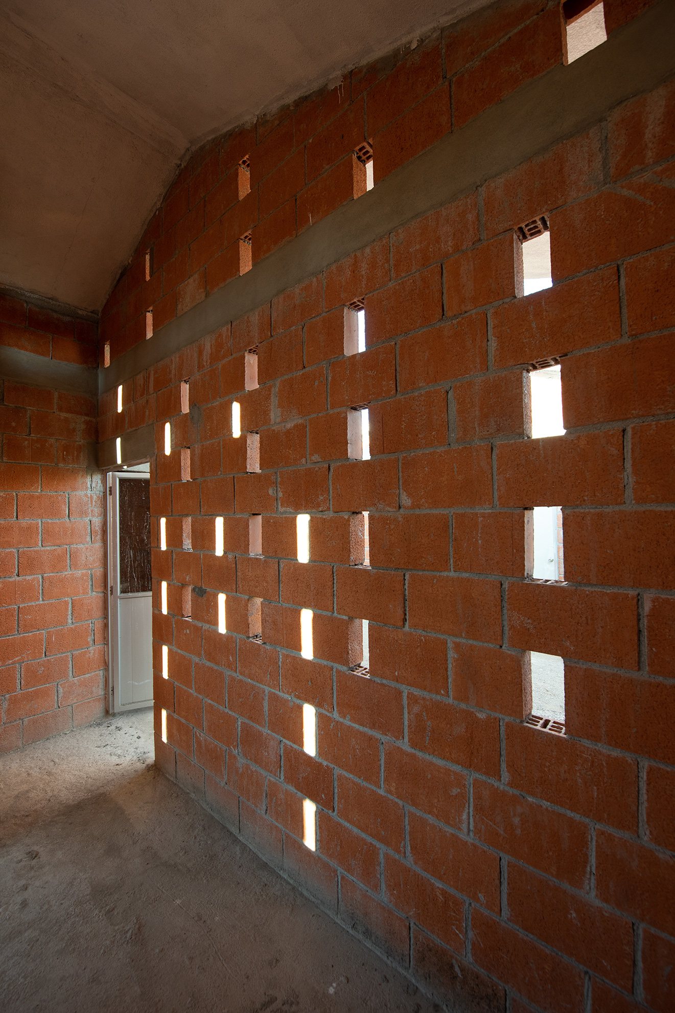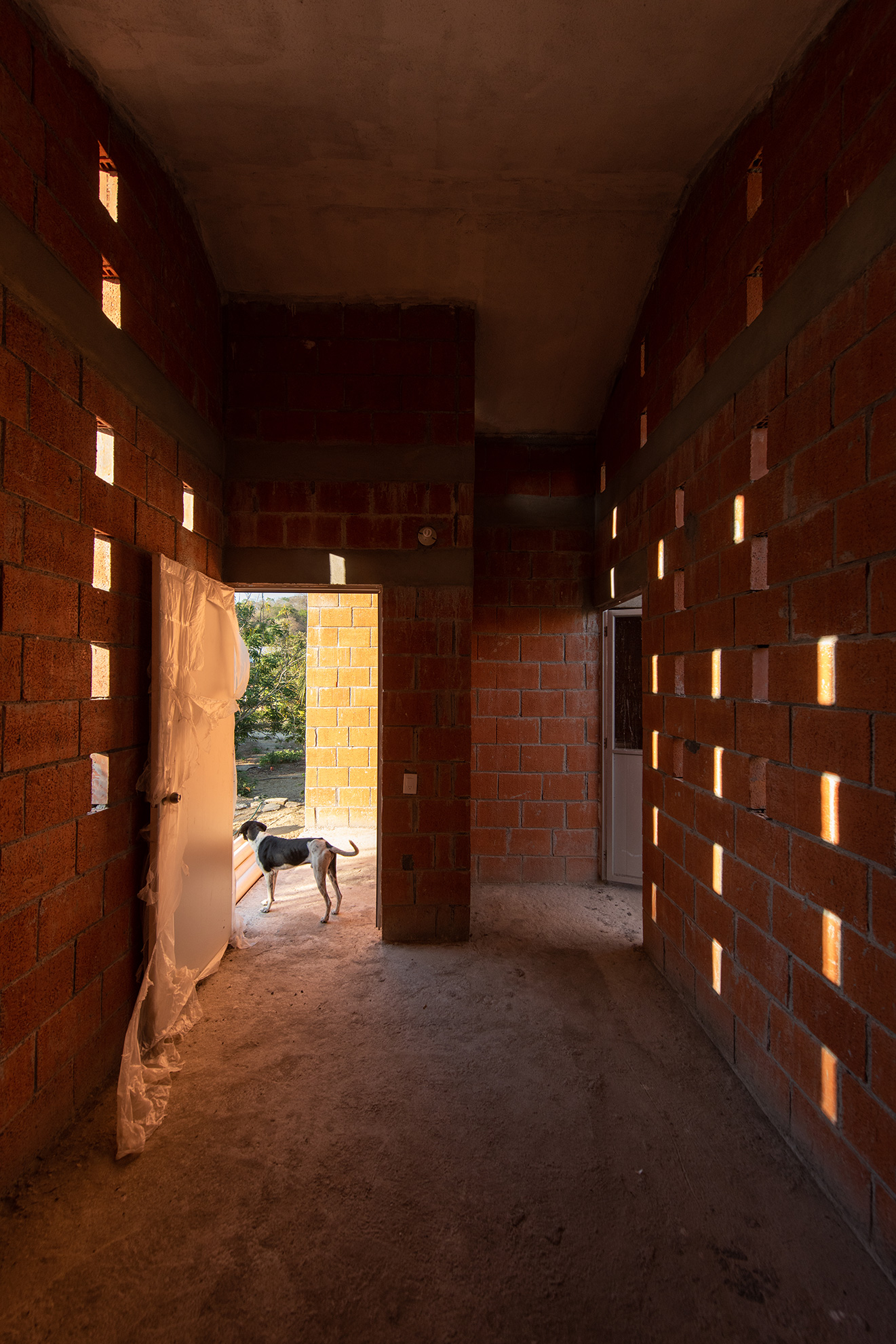 El vacío entre los dos edificios es un espacio abierto semi-privado que complementa el programa: se encuentran un área techada al aire libre para cocinar y comer, un baño que puede ser utilizado por tres personas al mismo tiempo pues tiene los usos divididos y un espacio sin pavimentar donde es posible sembrar un pequeño huerto o acorralar animales de granja como gallinas y cerdos. Este espacio también brinda potencial de crecimiento si es requerido por los usuarios. Los materiales fueron escogidos por su disponibilidad y precio, tabique prefabricado de barro para muros y concreto para la envolvente; en la envolvente la pintura blanca refleja los rayos del sol y está mezclada con impermeabilizante.
